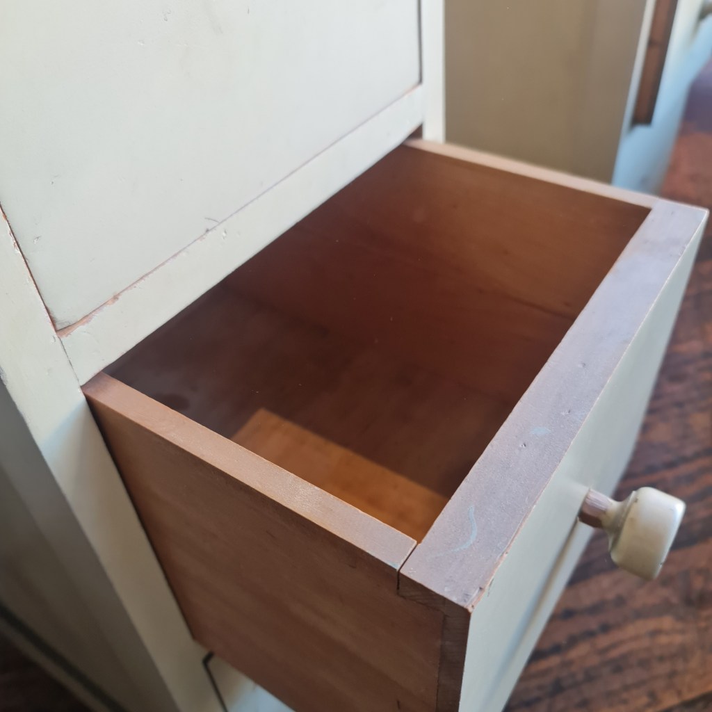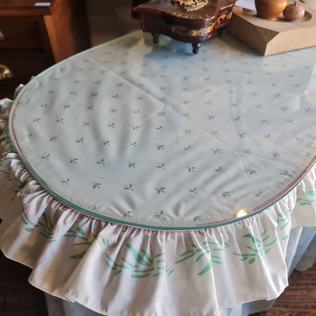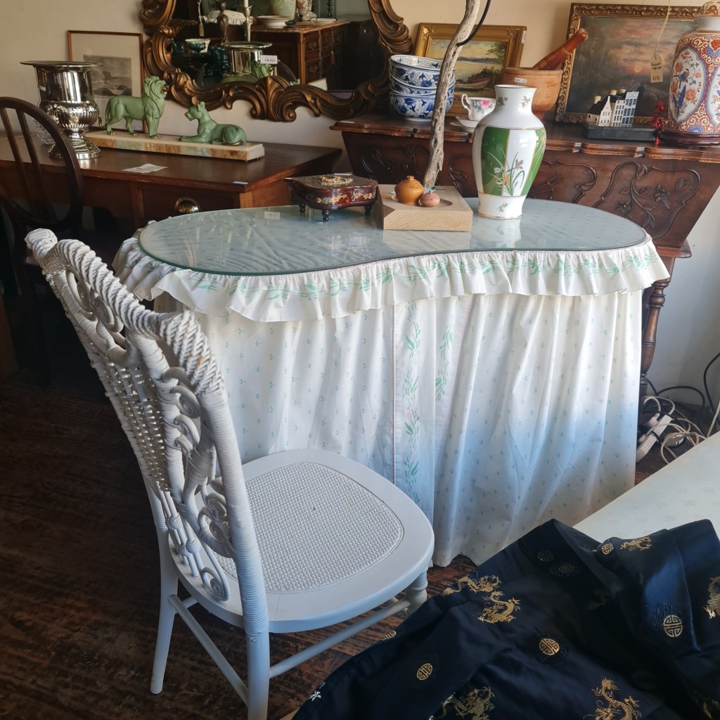 Dressing table with six drawers. The whole piece covered in fabric and under a specific, kidney shaped piece of glass. A great little work table where the fabric could easily be changed to taste. Some drawer knobs missing otherwise in good condition for a 1950’s piece of furniture. 110 cm x 50 cm x 76 cm high. Was $195, now $110 off at $85.
