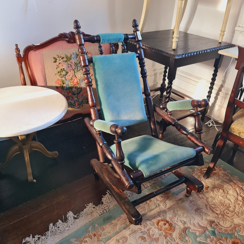 Blue platform rocker from the early 1900’s In good working order and with blue velvet upholstery. 105 cm high x 60 cm wide and 80 cm deep. Price is $120.