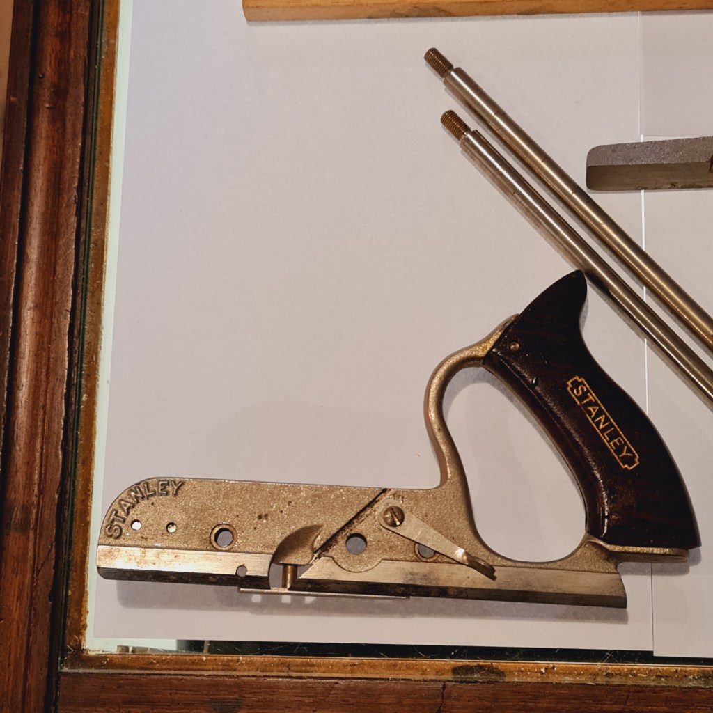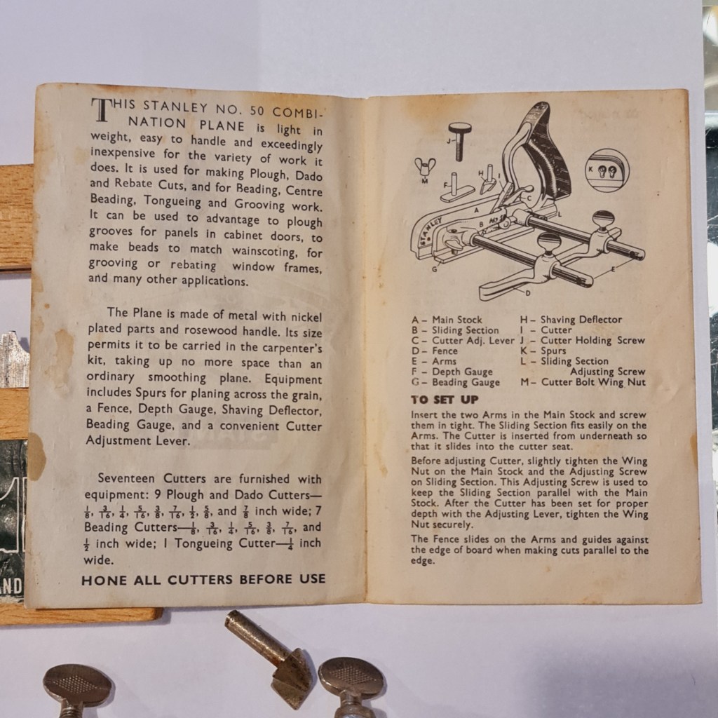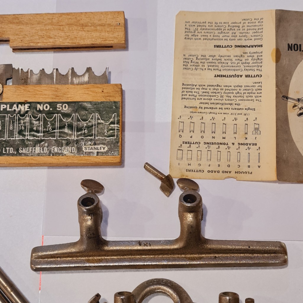 Also, we have a Stanley No 50 combination plane made in the UK between 1880 and 1950. The exact date of this example is less certain. . From the same original family and house in a wine box measuring 12 cm high 34 cm wide and 23 cm deep. $385.