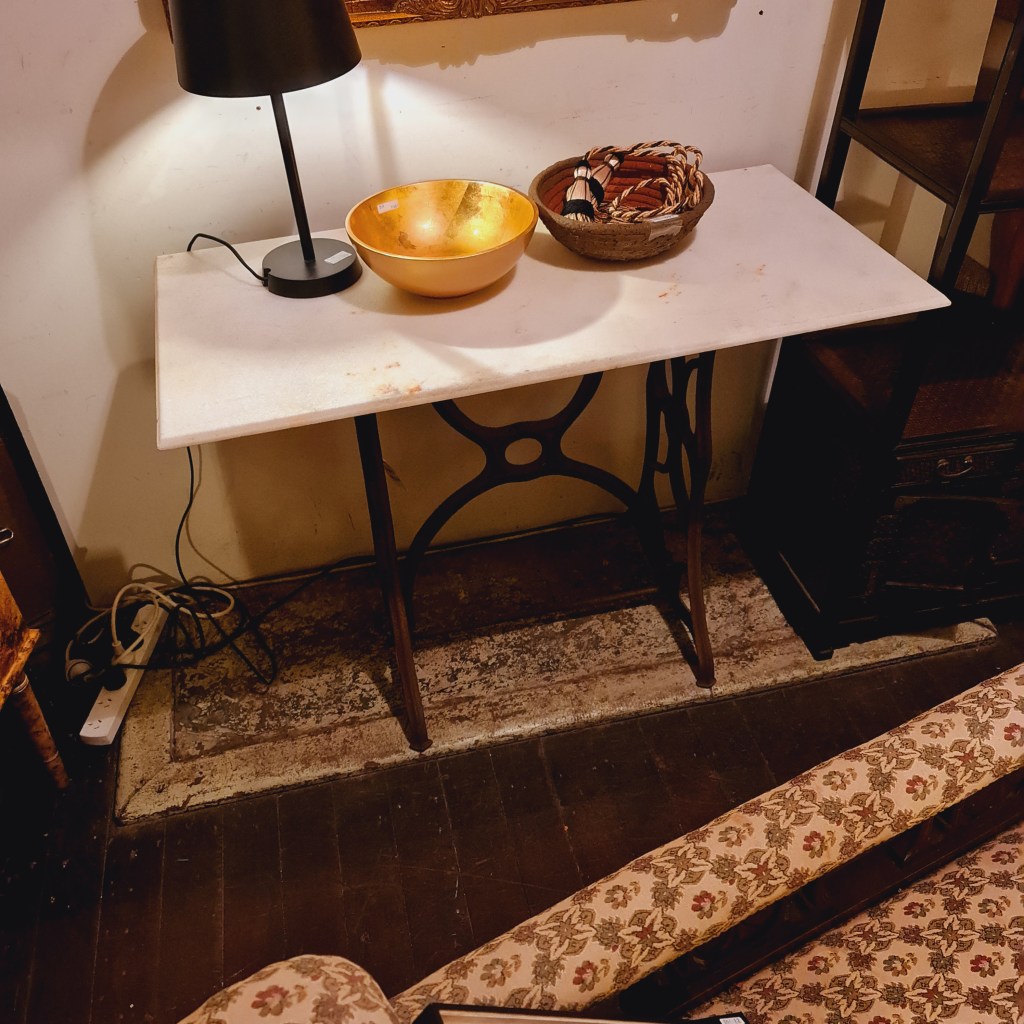 Marble topped sewing table for interior or outdoor use. Some rust marks on the marble. 72cm high x 100 cm wide and 50 cm deep. $240.