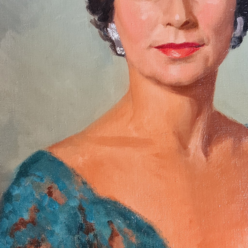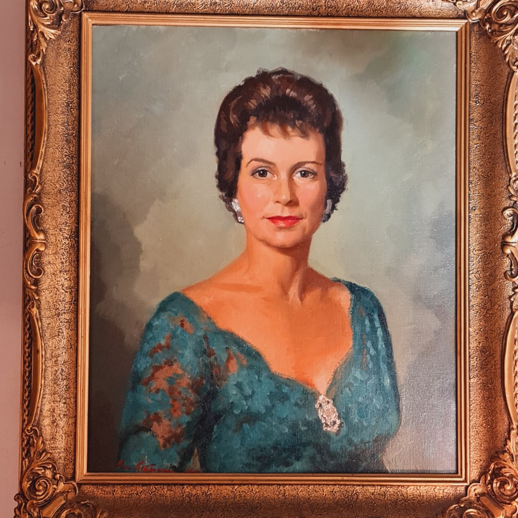 Portrait of Ms Brenda Nicholas, painted by Mr Paul Fitzgerald. Ms Nicholas married into the noted Melbourne Nicholas family. Mr Fitzgerald (born 1922) was a widely recognized portrait artist whose subjects have included Sir Robert Menzies Queen Elizabeth II and Pope John XXIII. Ref. McCulloch p. 426. Oil on canvas, in a correct for period frame measuring 78 cm x 68 cm . Exposed work is 60 cm x 40 cm. Price is $790.