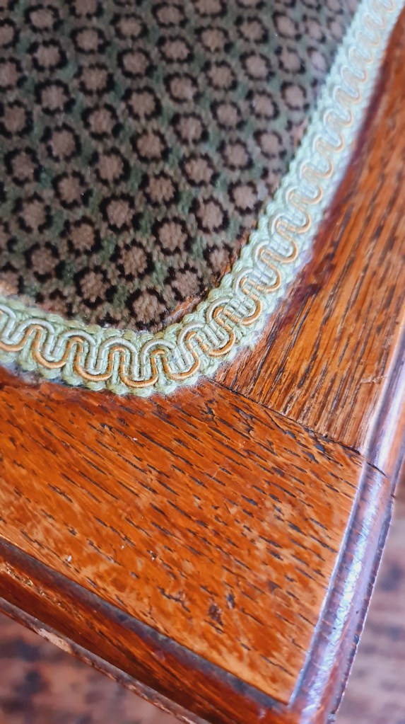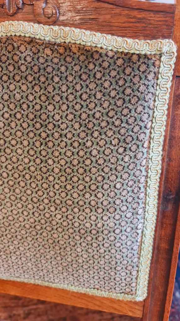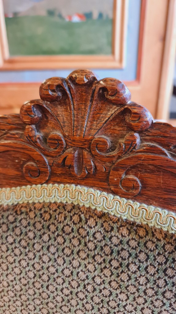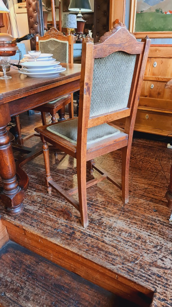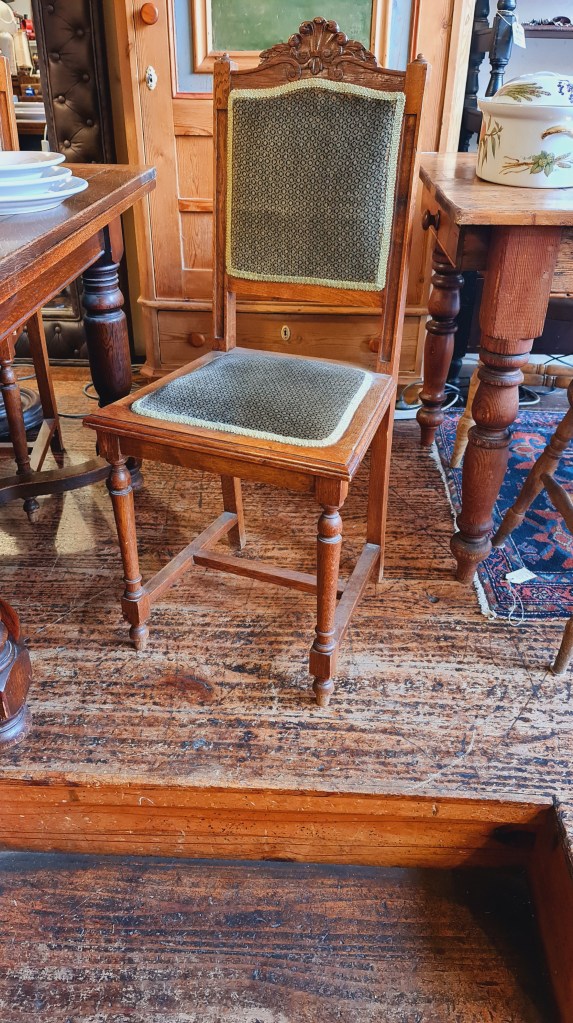 Set of six (6) French oak chairs with later sympathetic upholstery. Made in the early 1900’s they are all well sprung with solid frames. Each is 100 cm high x 42 cm wide and 45 cm deep. Price for six is $390.