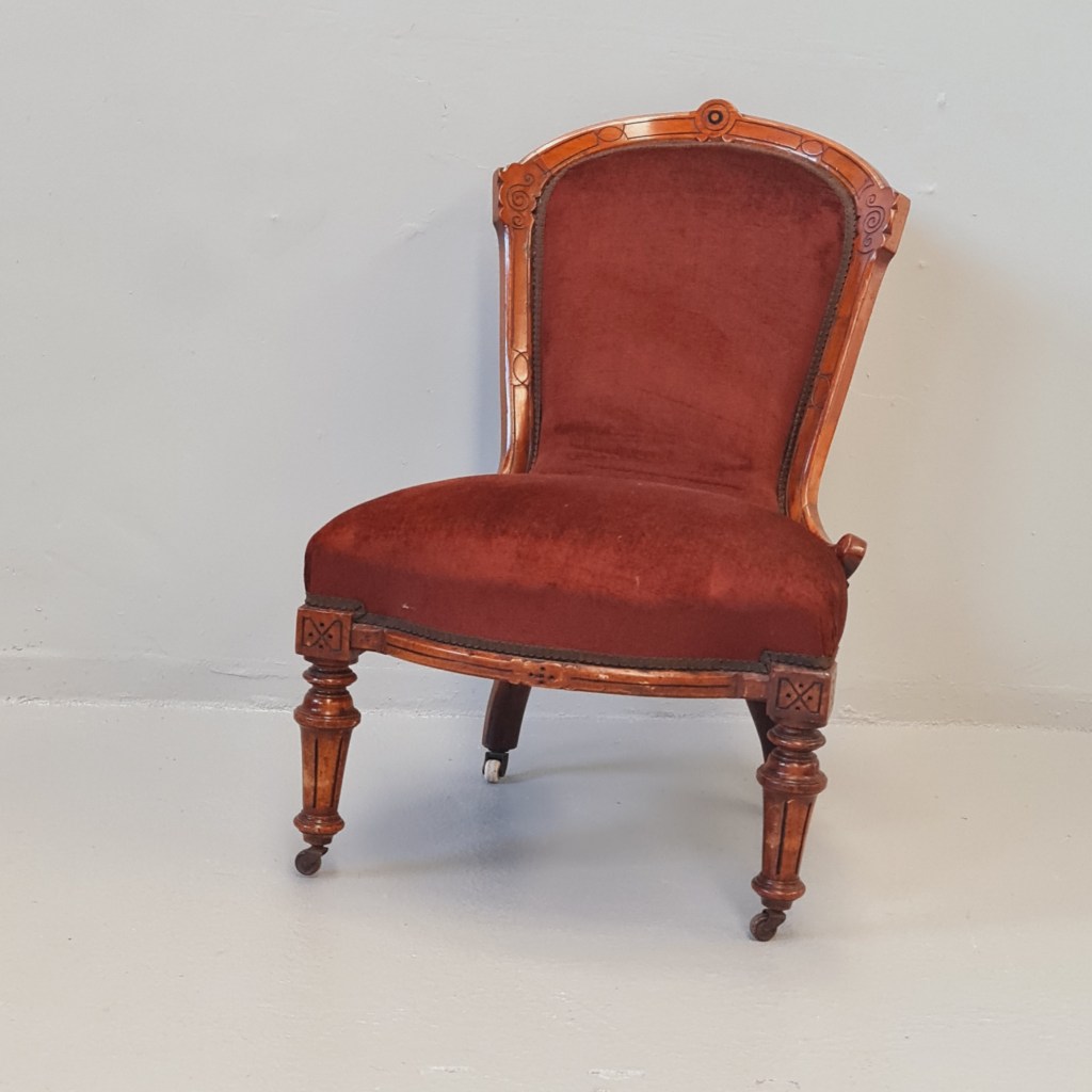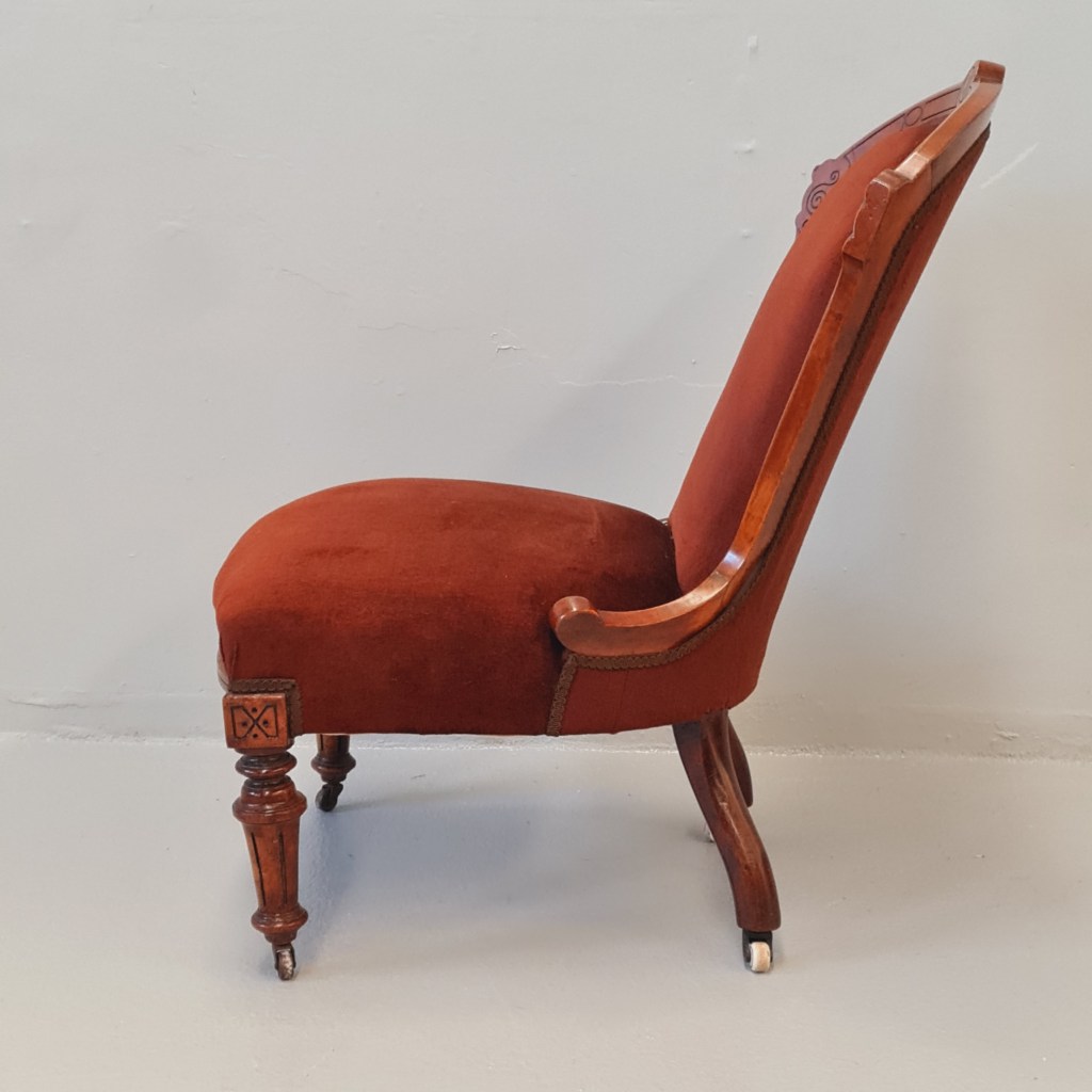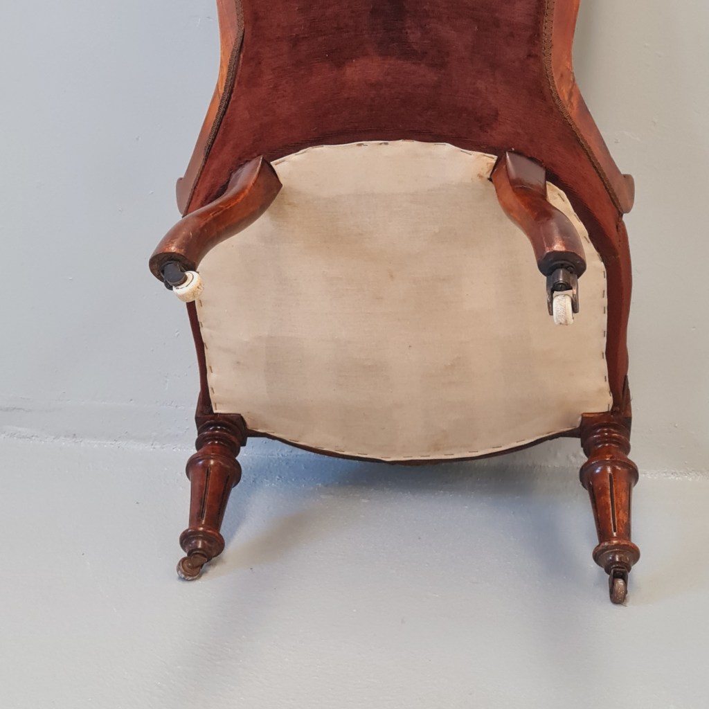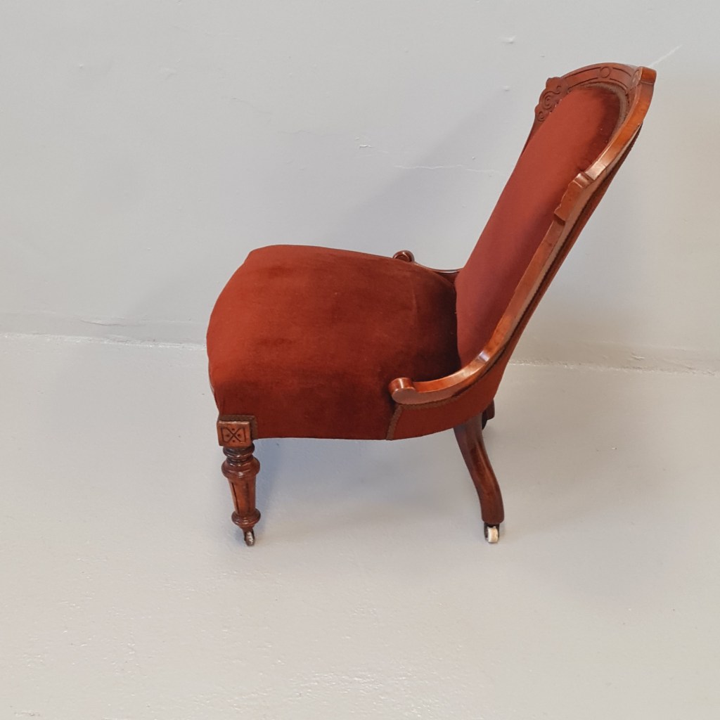 Victorian slipper or nursing chair with brown velvet fabric, strong frame and springing and original castors.