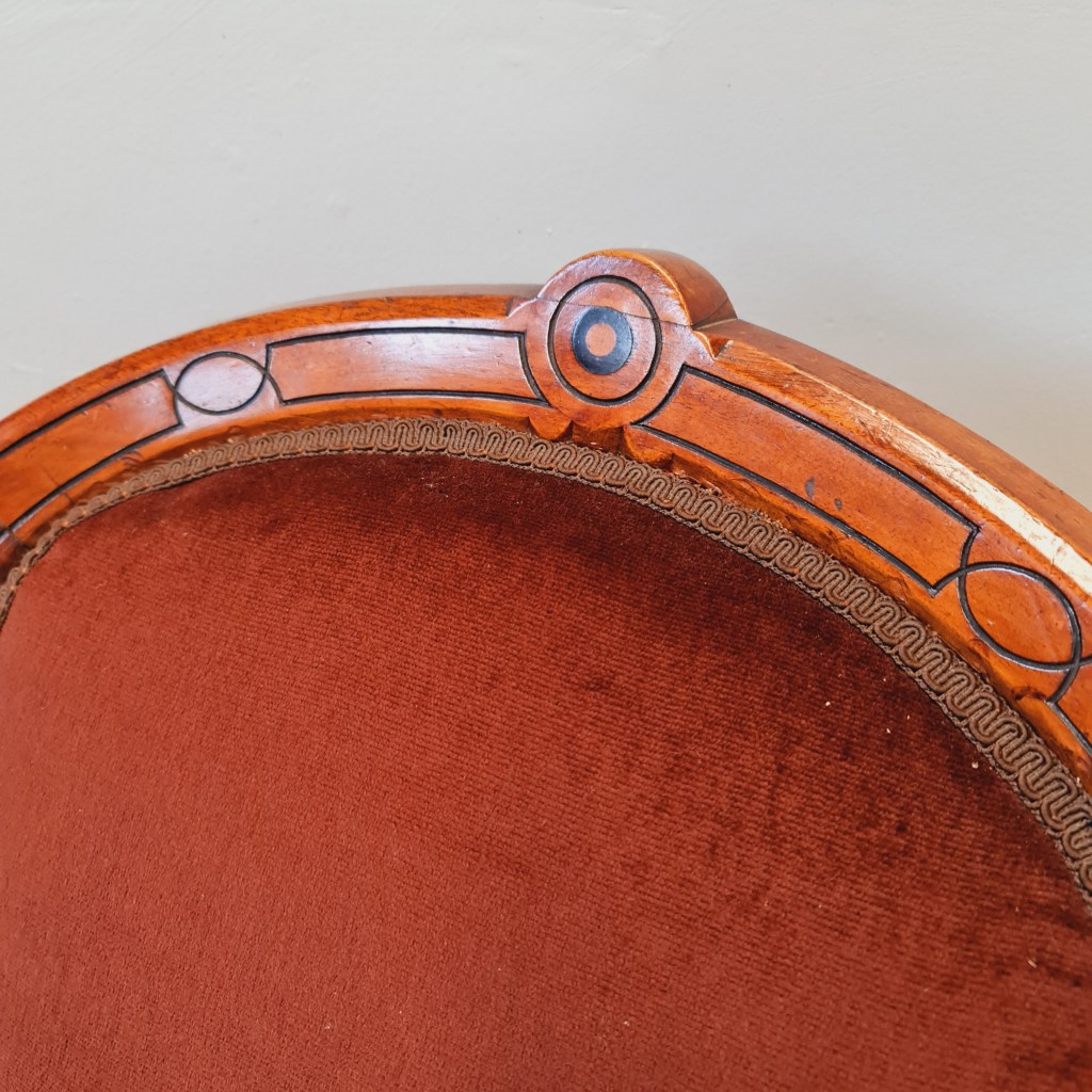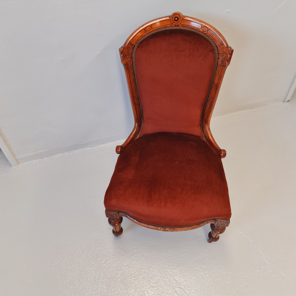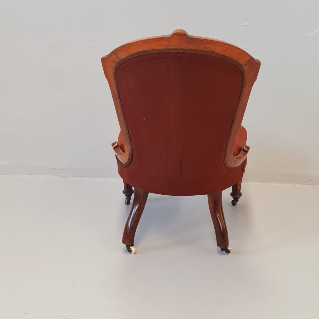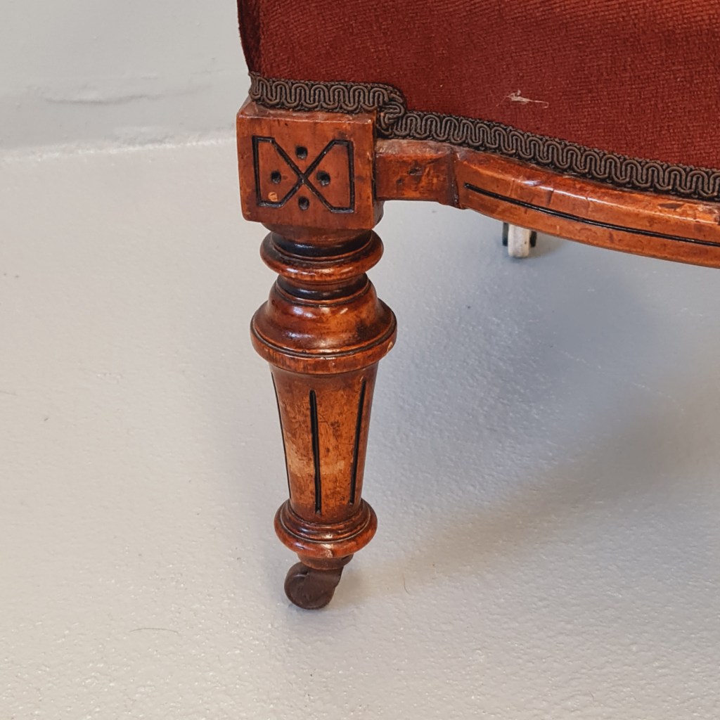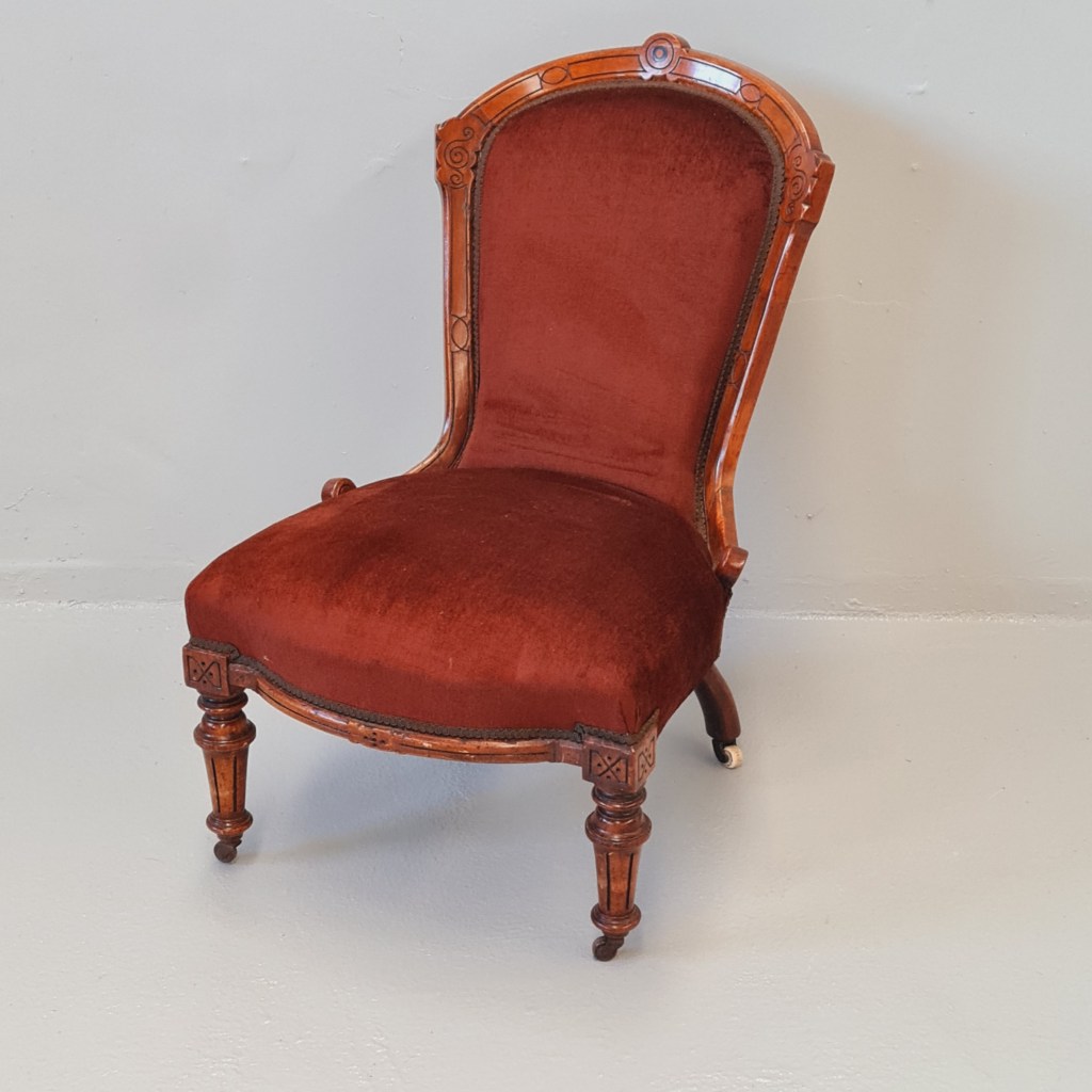 Victorian slipper or nursing chair with brown velvet fabric, strong frame and springing and original castors.
