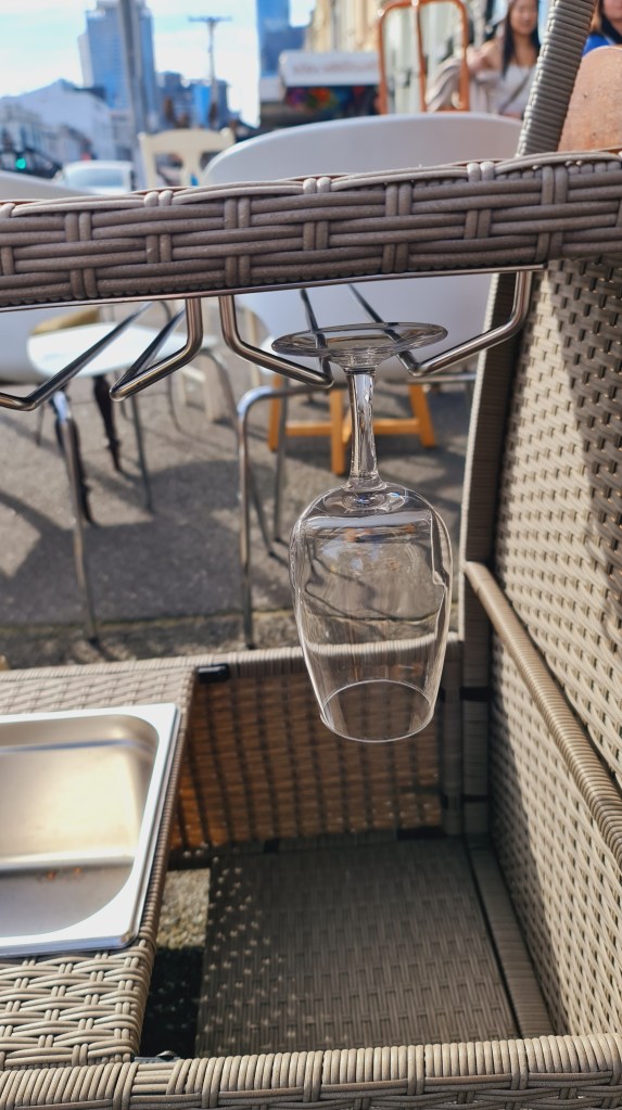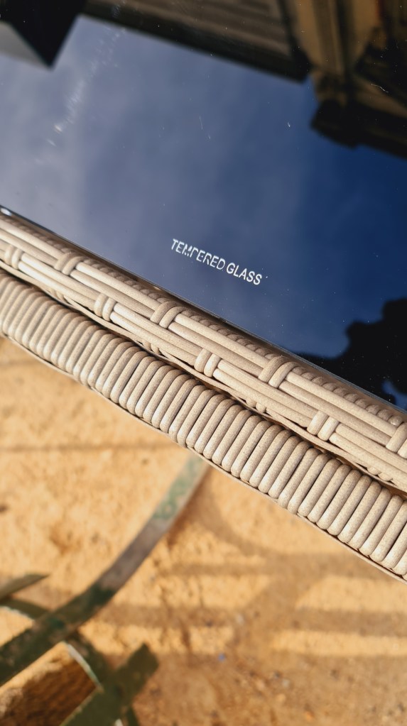 Bar cart for outdoor use with two castors, ice and wine glass storage. Tempered black glass top. 90 cm high at the handles, 108 cm long and 46 cm wide. Price is now $125.
