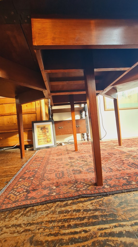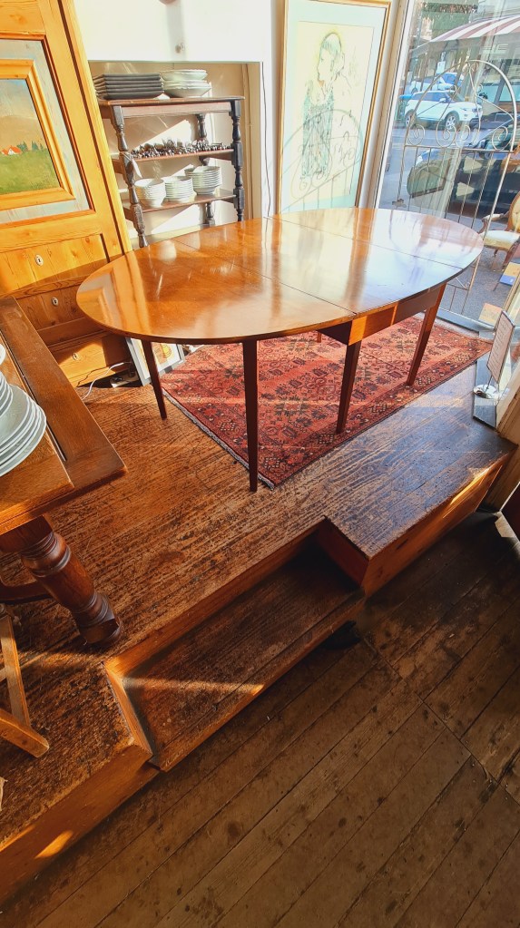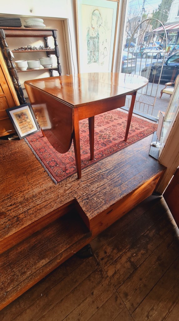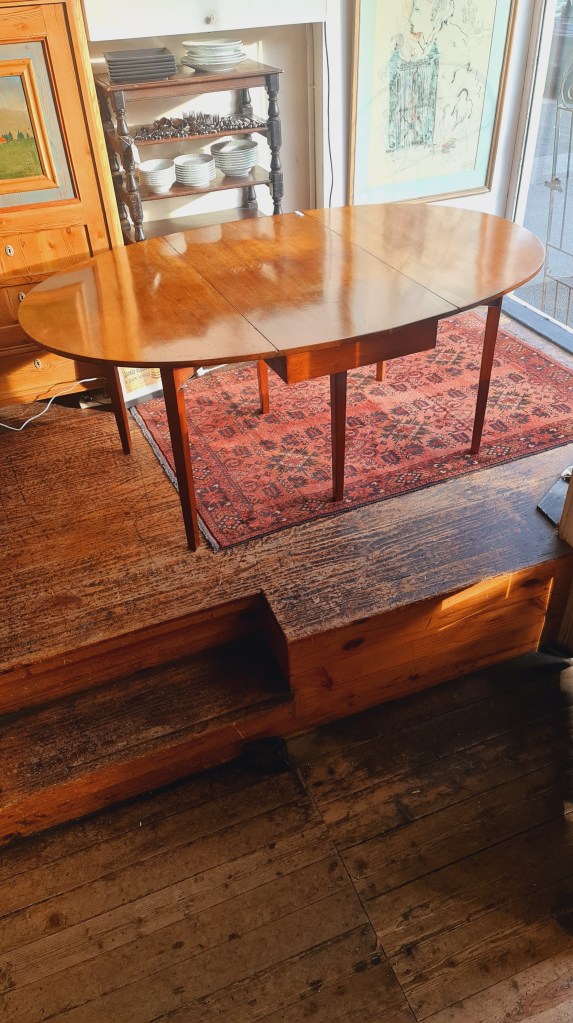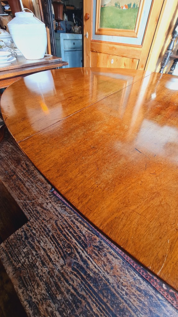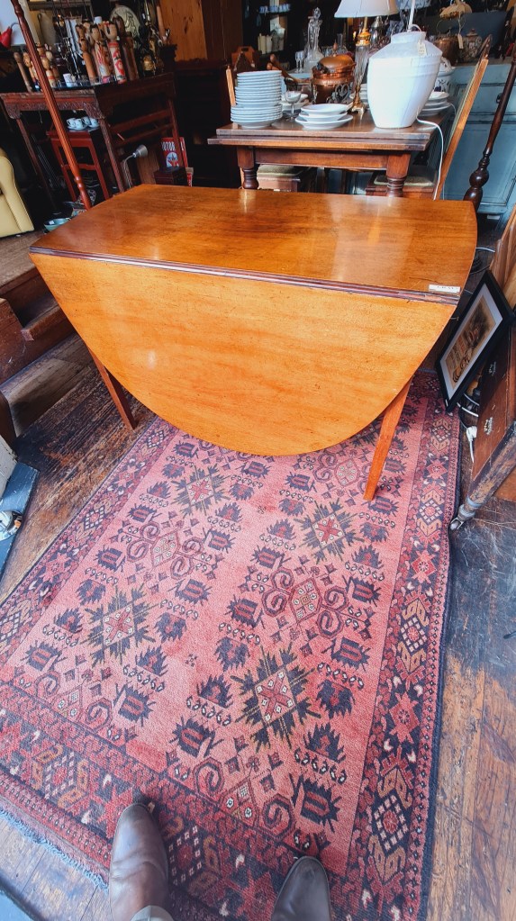Drop sided dining table from the Georgian period. A very elegant and practical piece of furniture that can be used with one flap up if required. Closed 74 cm high x 115 cm long and 60 cm deep. Each panel is 63 cm deep and the table when fully open would seat 6 plus with a top measuring 115 x 185. $890.