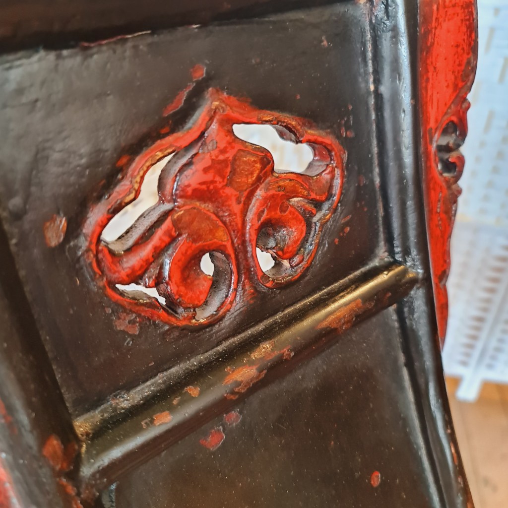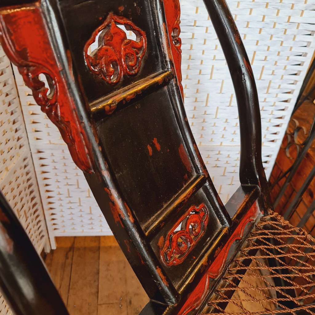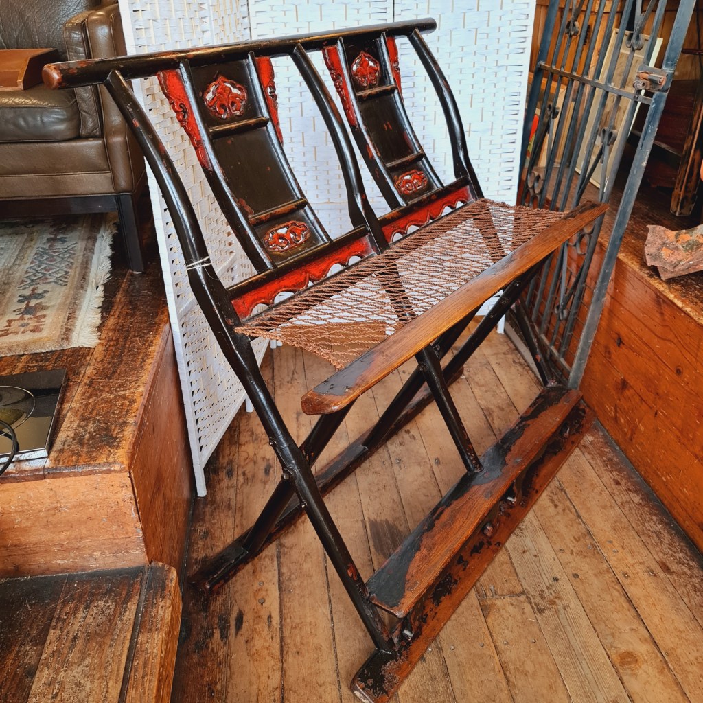A very rare Chinese antique hunting stool with intact woven mesh seat. This is an extremely rare and also, practical item with fine paintwork in red and black. 103 c high x 111 c wide and 60 c deep. Price was $490, now $100 off at $390.