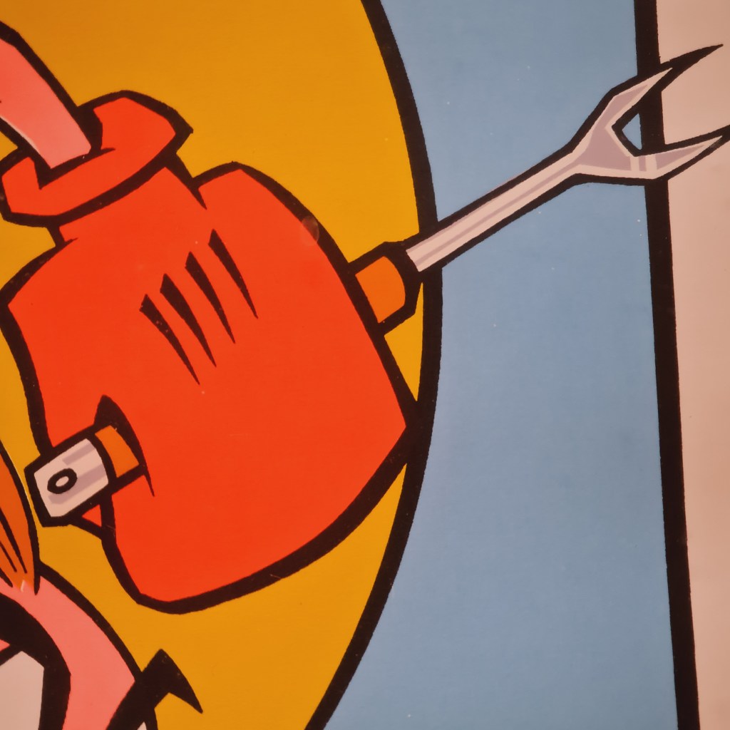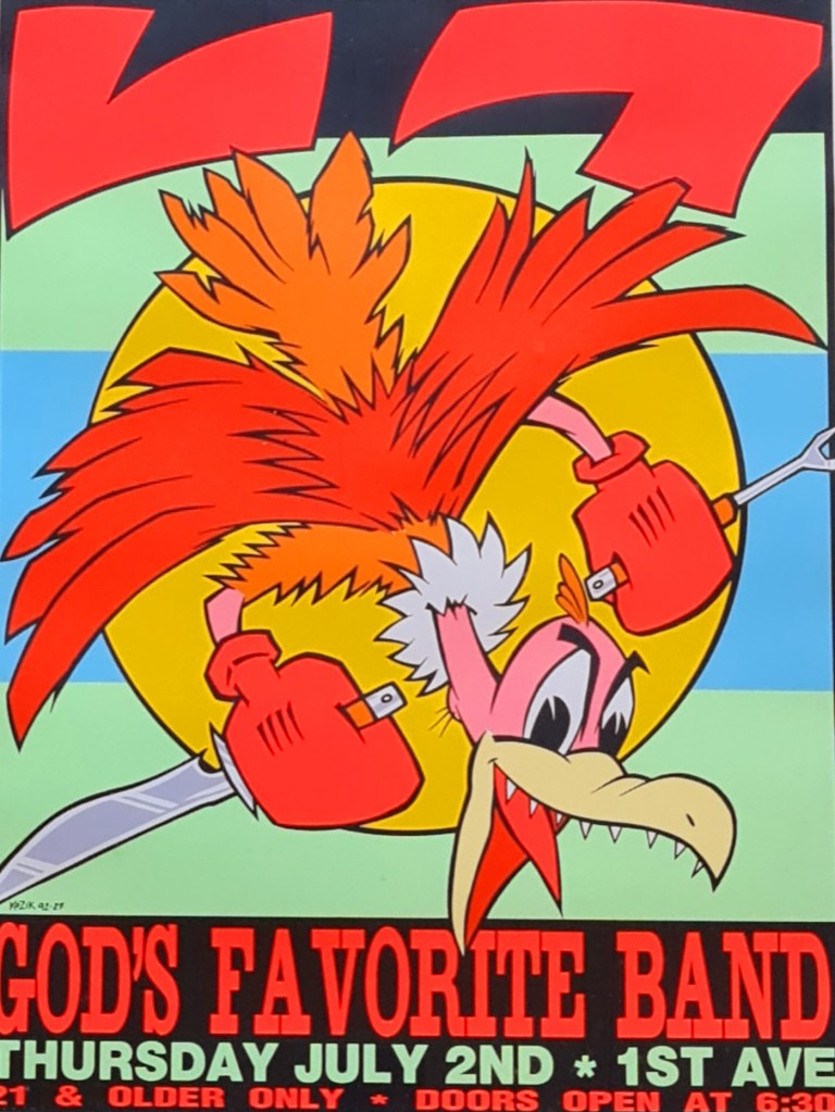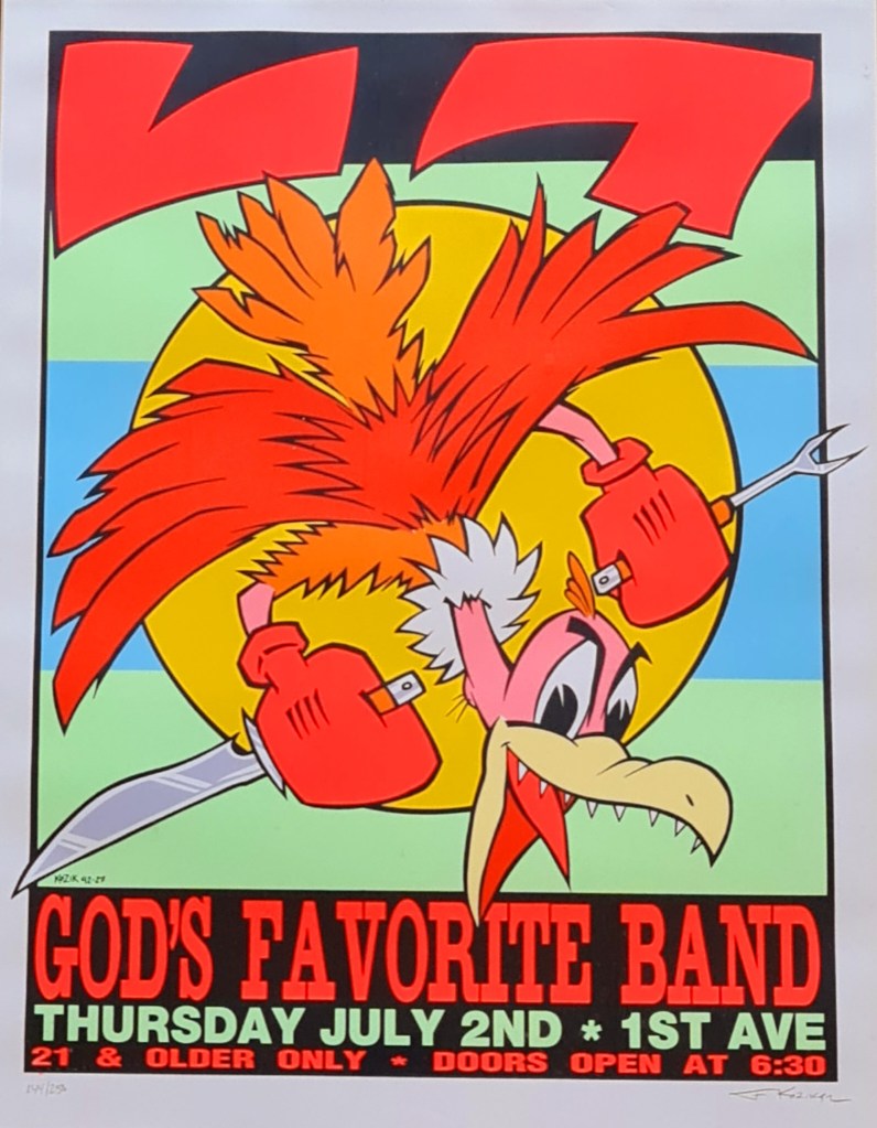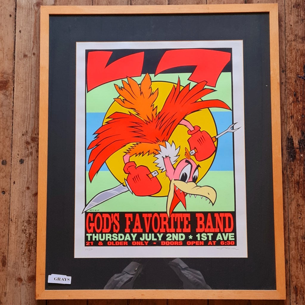 Colourful lithograph by American artist Frank Kozik (1962-2023). Number 144/250 is this series “God’s Own Band”. We also have another work by the same artist. Measurements are frame, 74 c x 62 c and the exposed work is 55 x 43. Price is $350