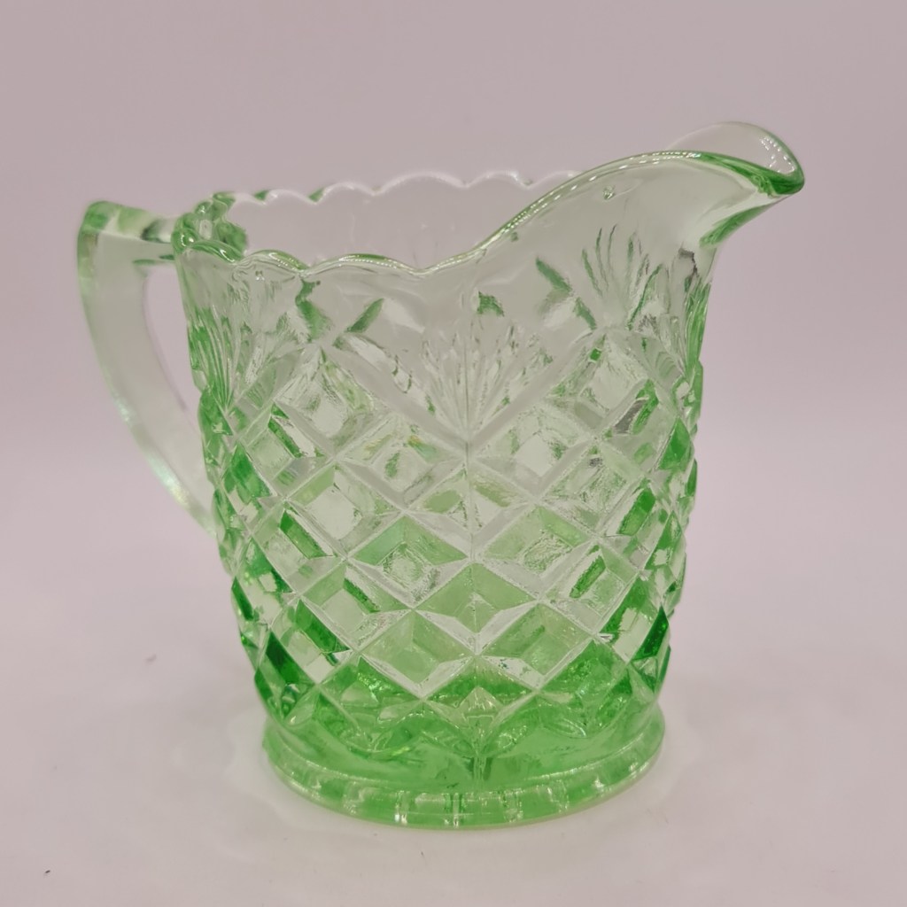Green uranium, also known as depression glass jug. 85 mm high. $24.