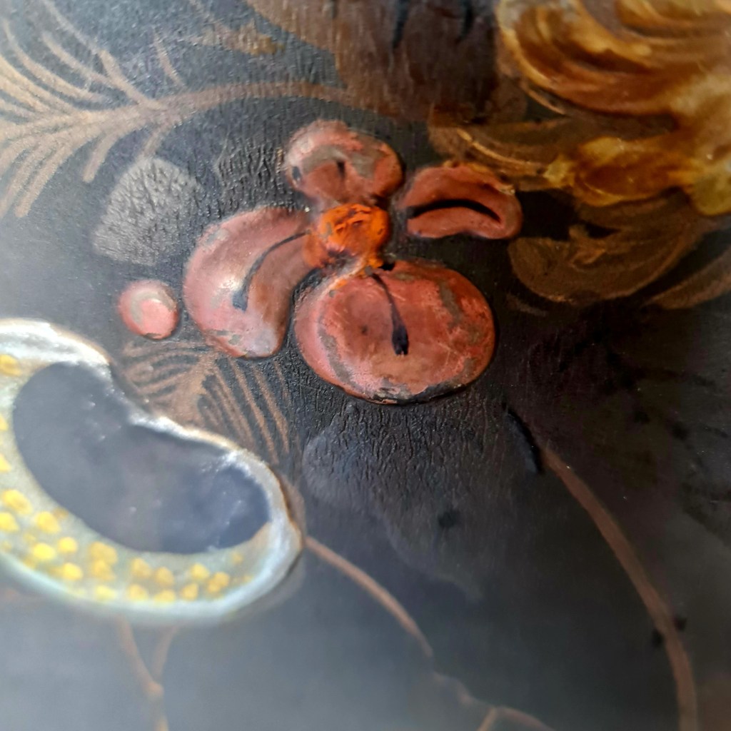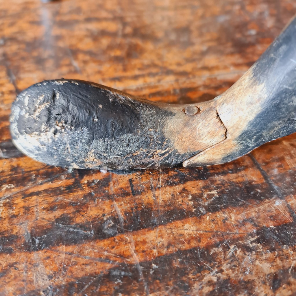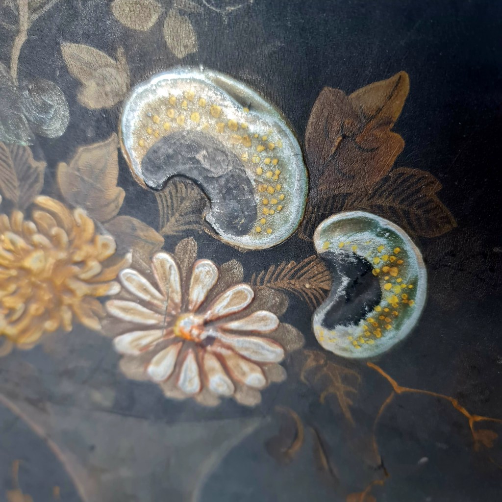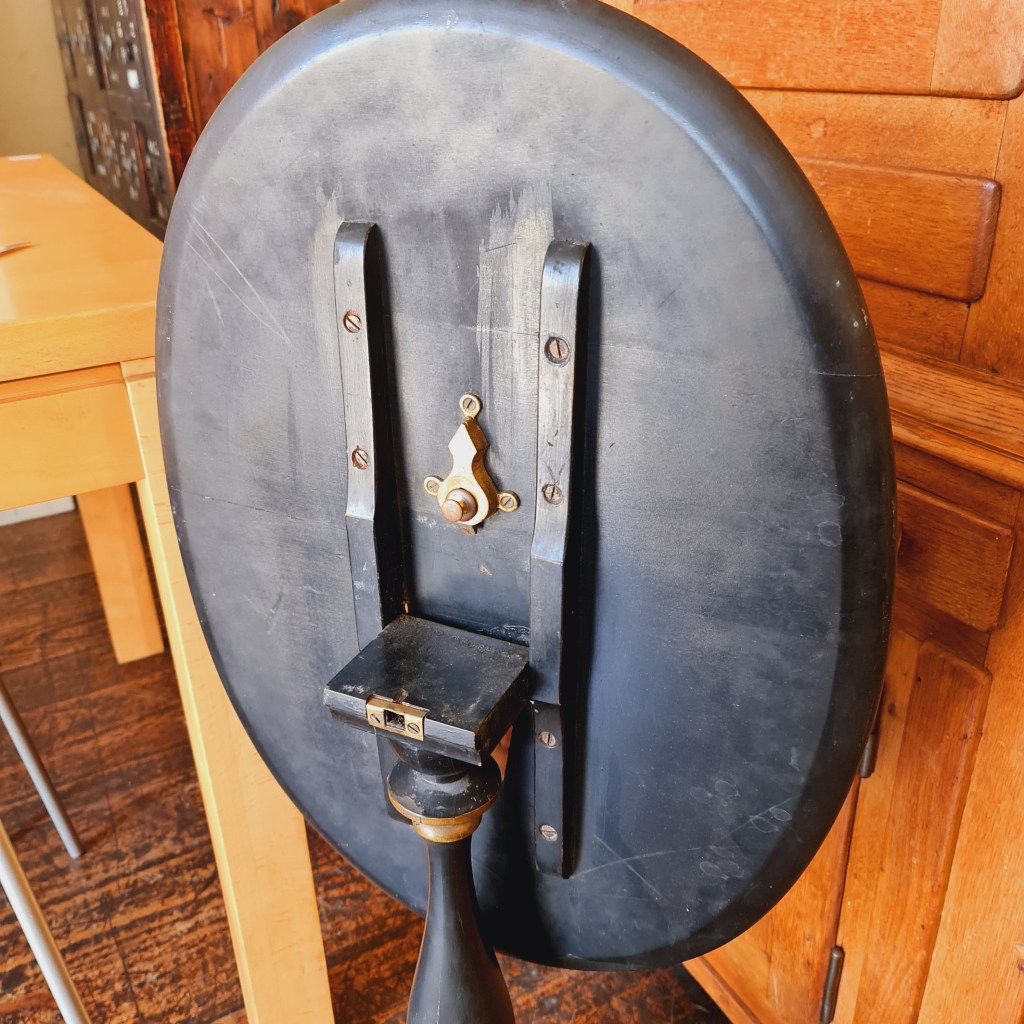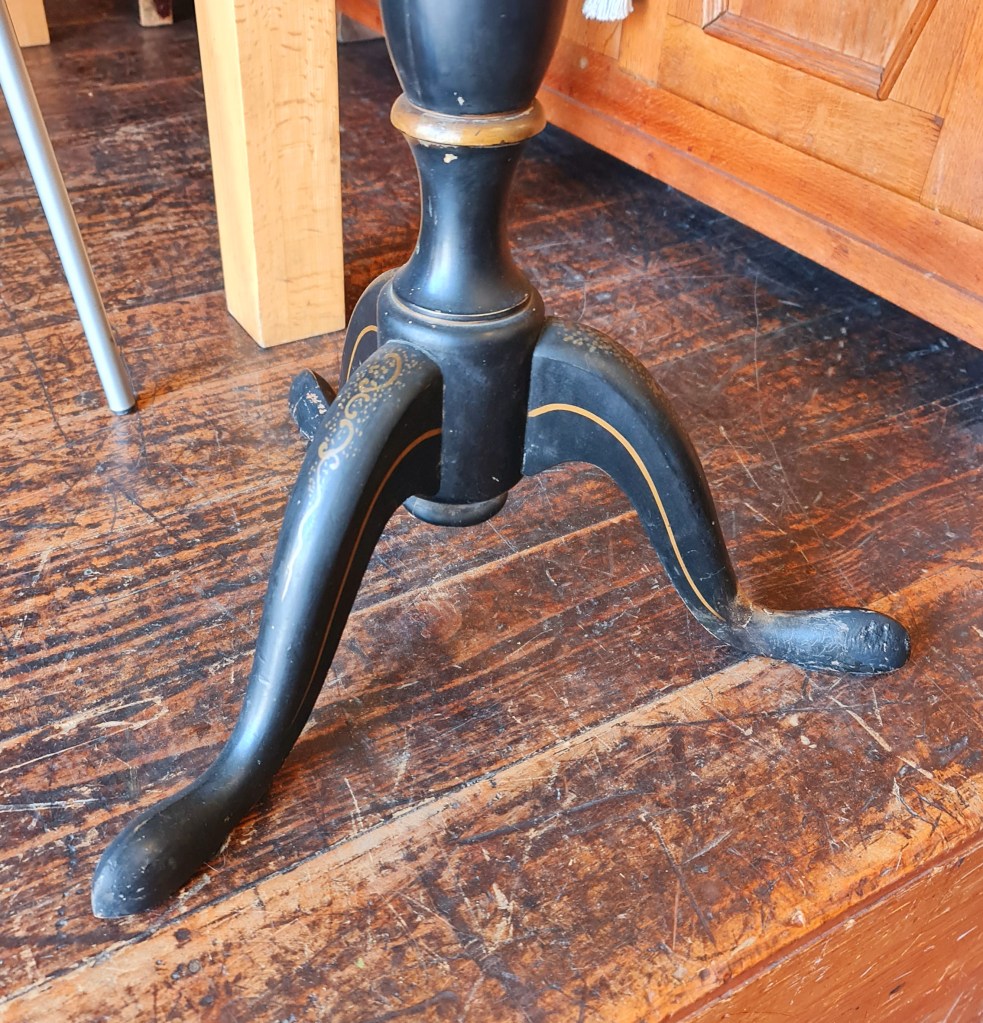 Unusual oval table with tilt top made in Grand Rapids, Michigan, in the mid to late 1800’s. The top is hand painted and features a vase and flowers.. There is an honest repair on one foot that appears to rectify the issue. The top is 63 cm high and 59 long x 43 wide. Price is $345.