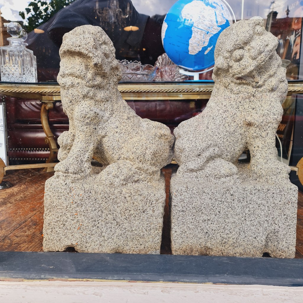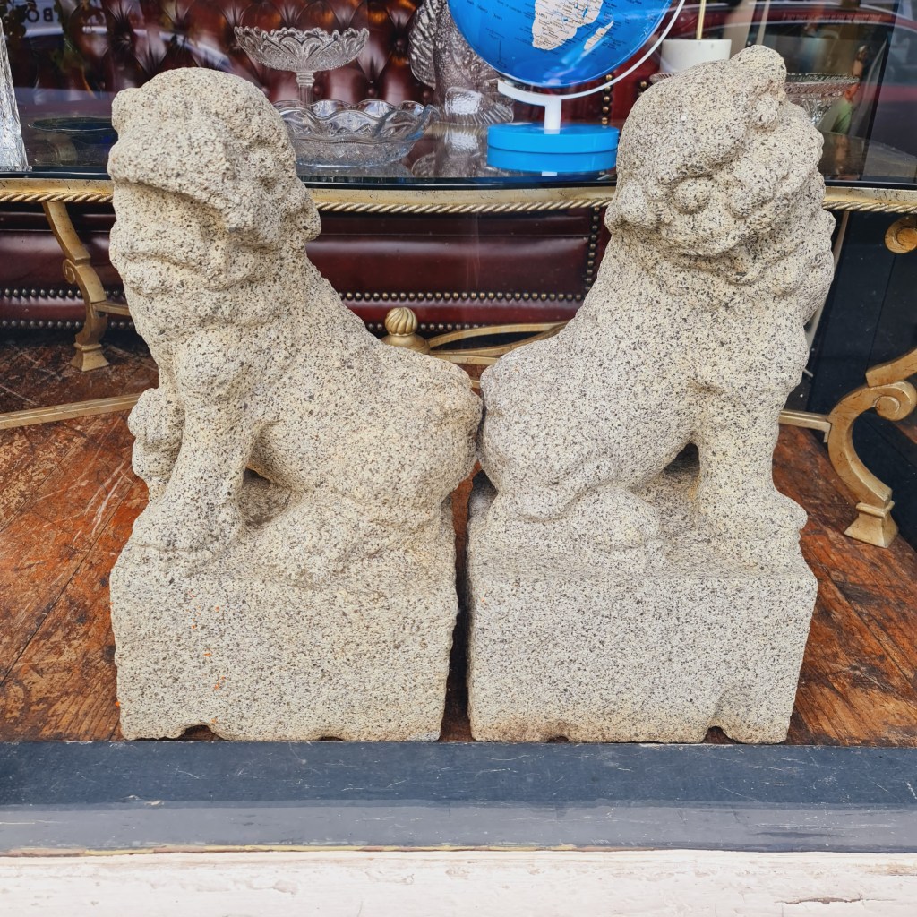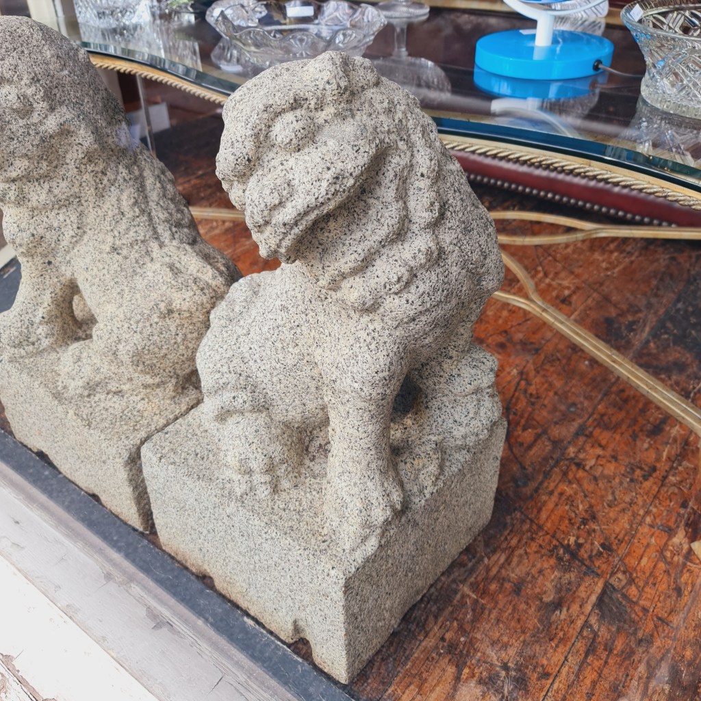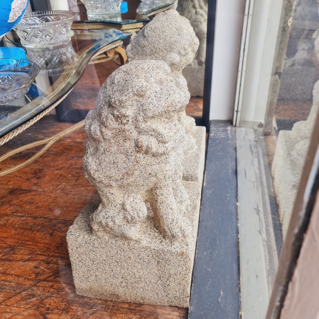 Stone Foo Dogs. A pair of large statues with bases in the classical temple dog style. 60cm high with bases that are 30cm square. Price is $590 for two.