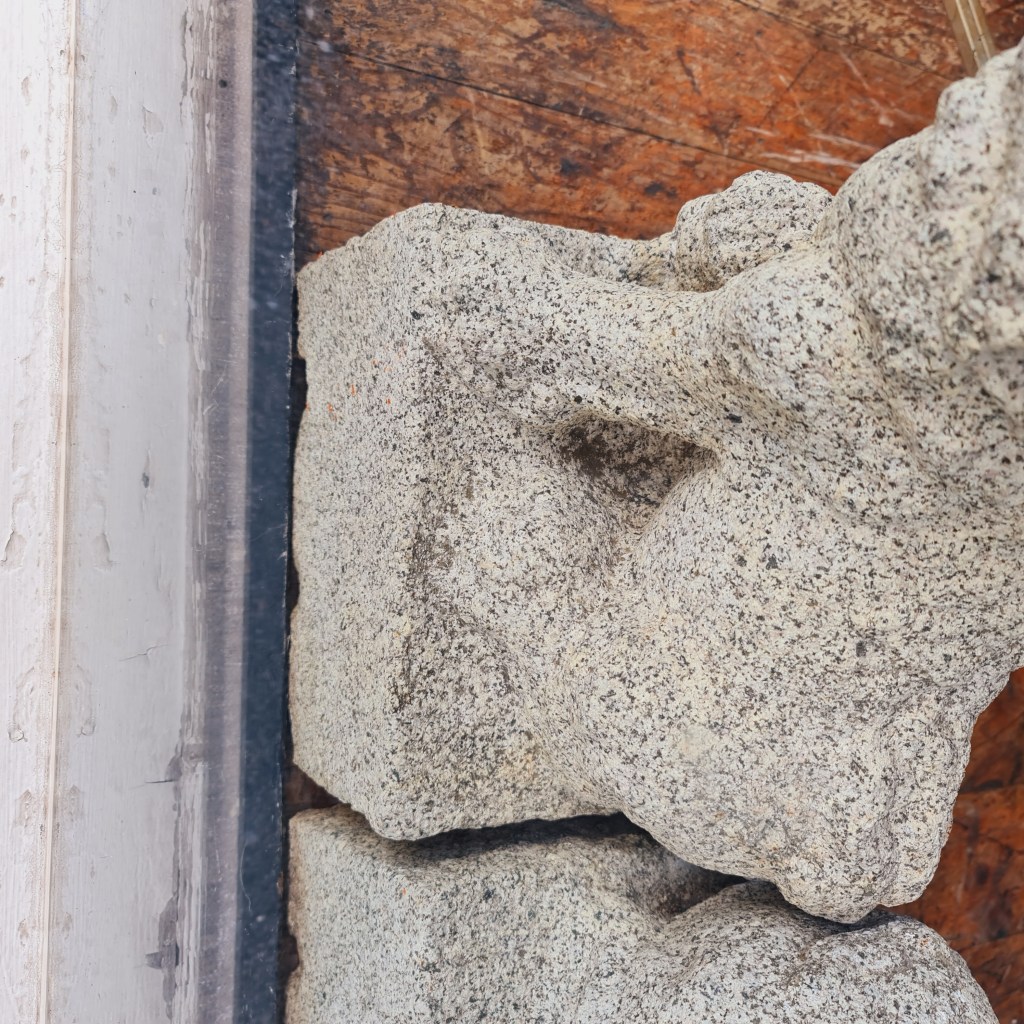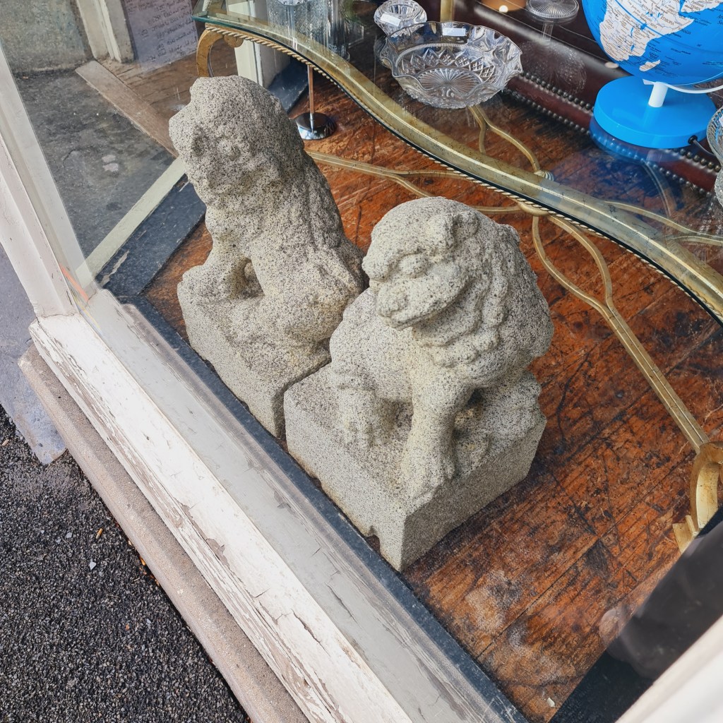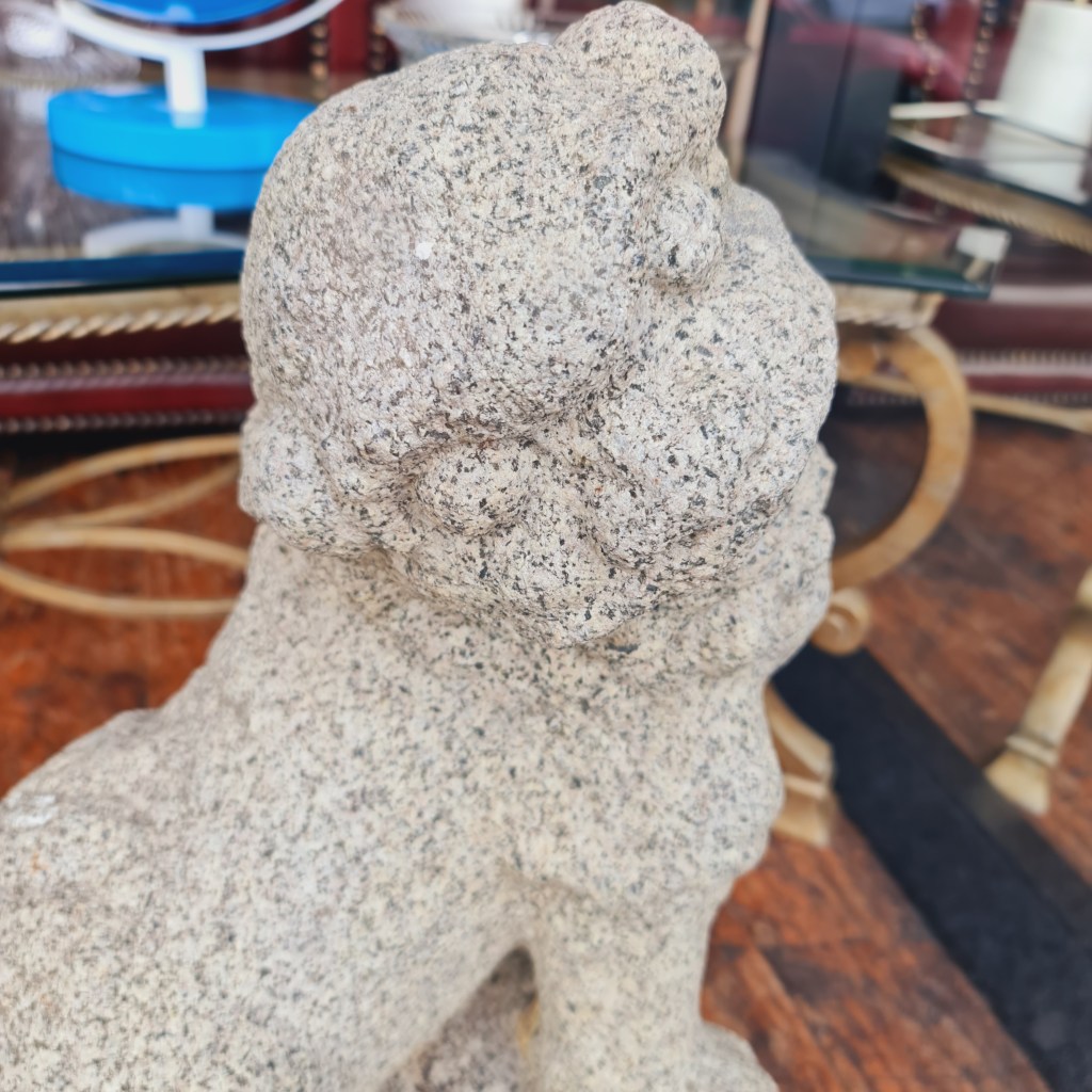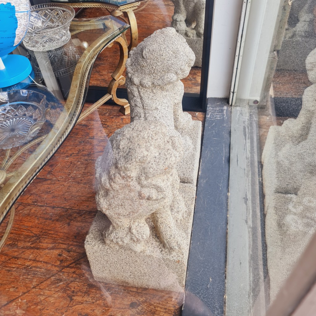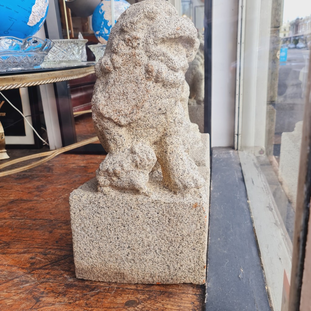 Stone Foo Dogs. A pair of large statues with bases in the classical temple dog style. 60cm high with bases that are 30cm square. Price is $590 for two.