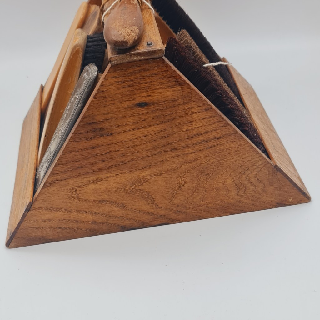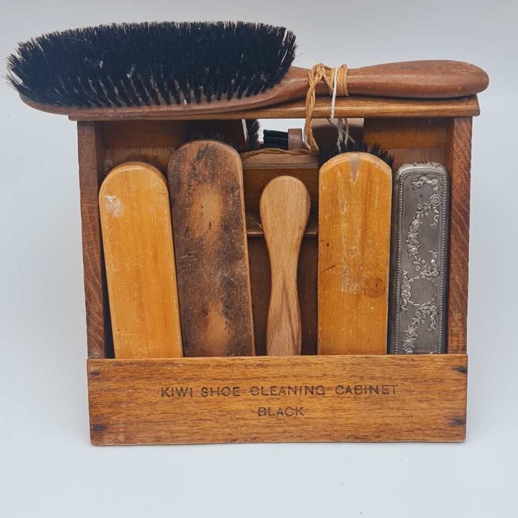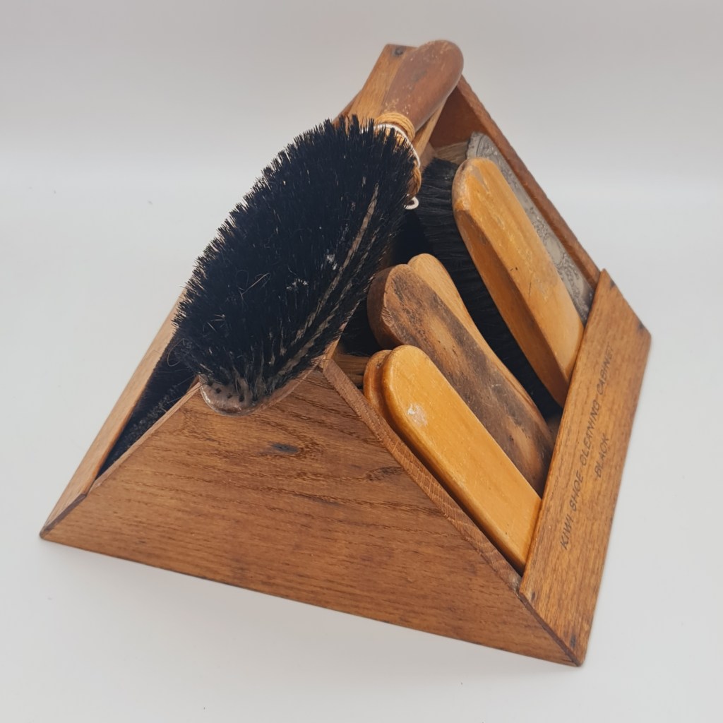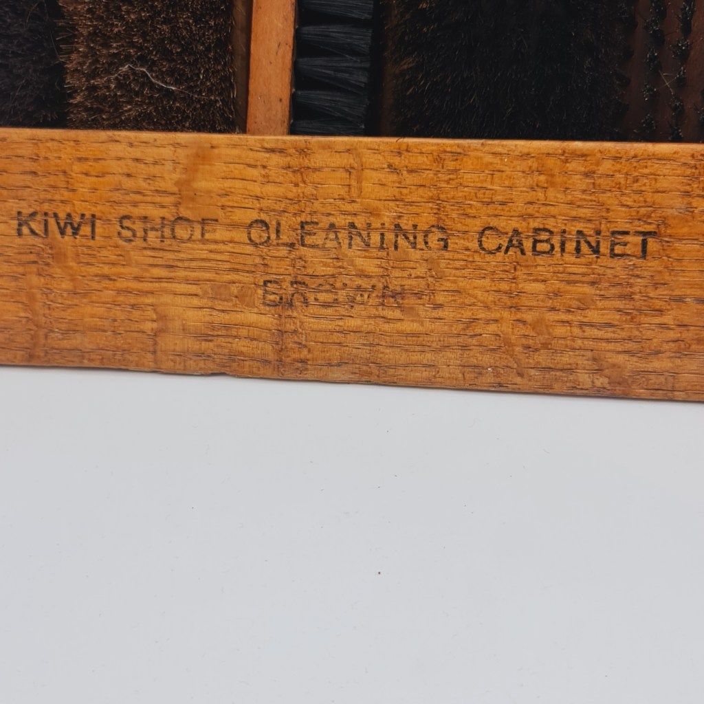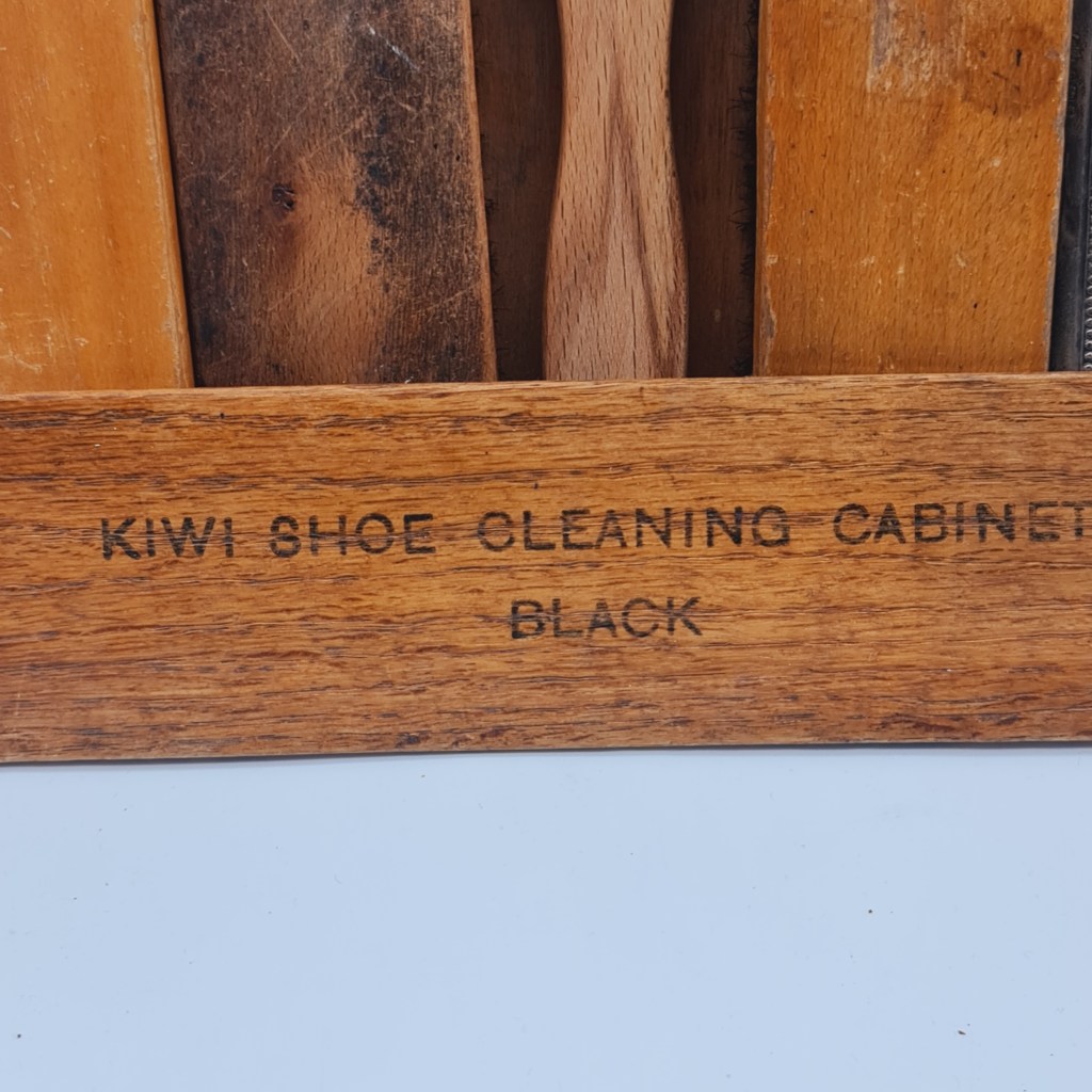 Kiwi shoe polish box from the early to mid 20th century. Hardwood and labelled either side as black or brown. 21 cm high x 30 cm square. $110.