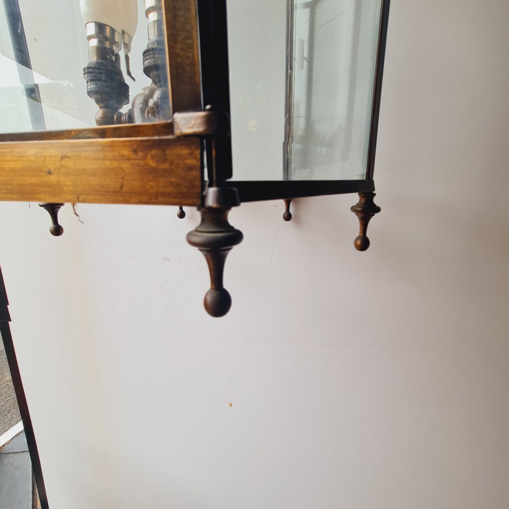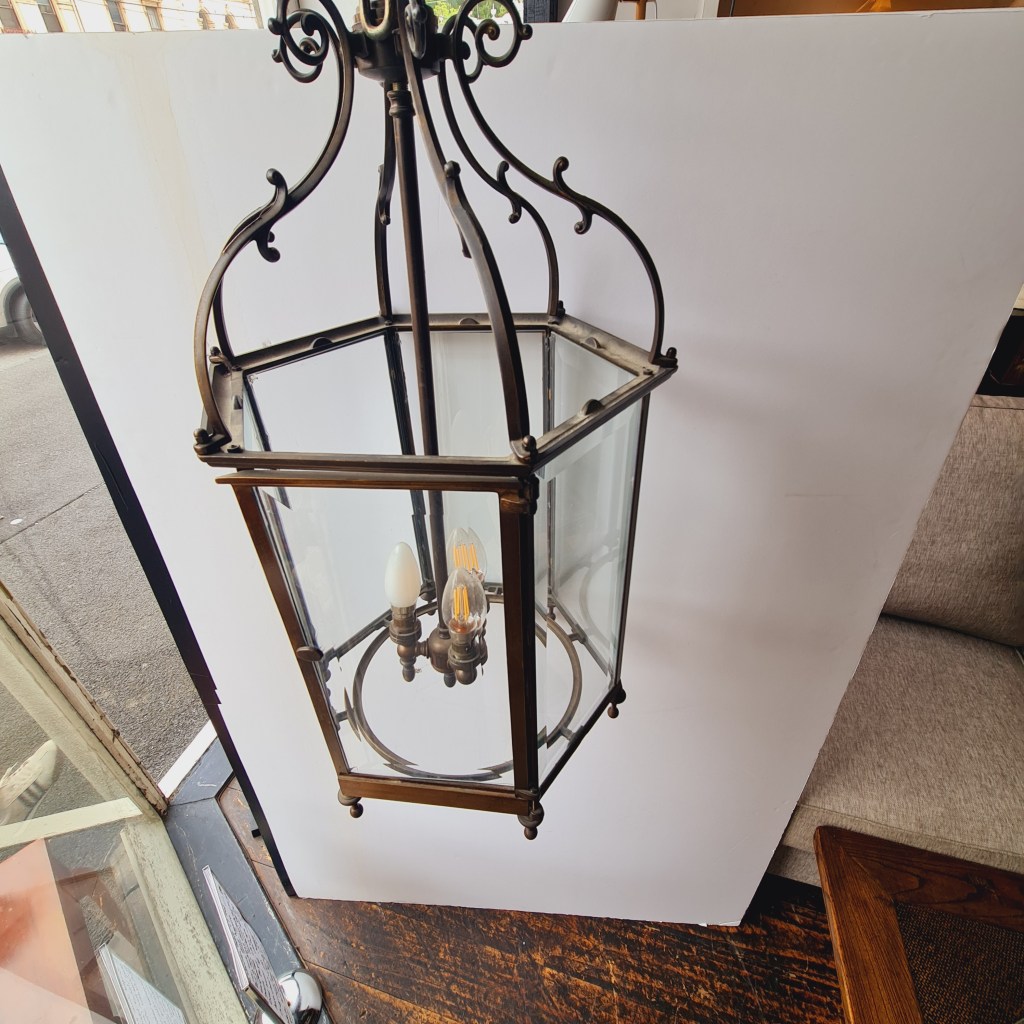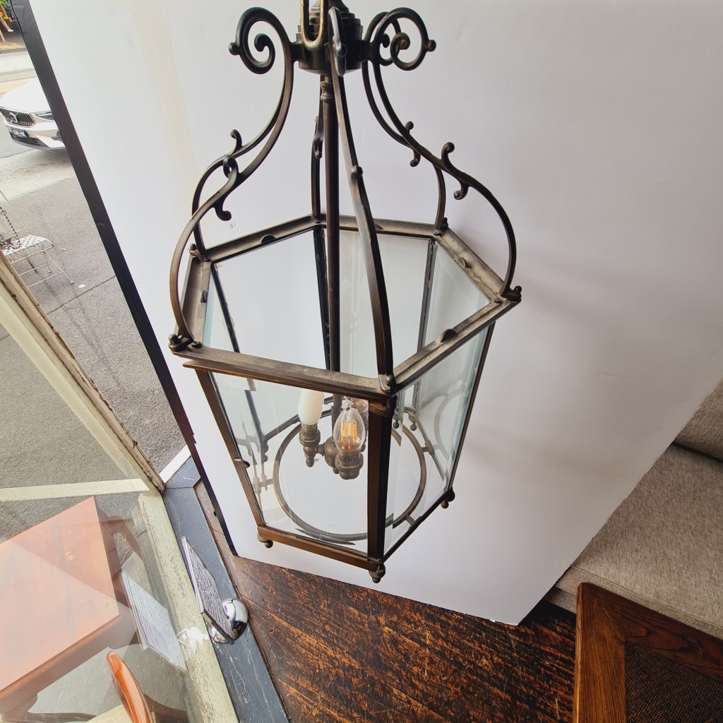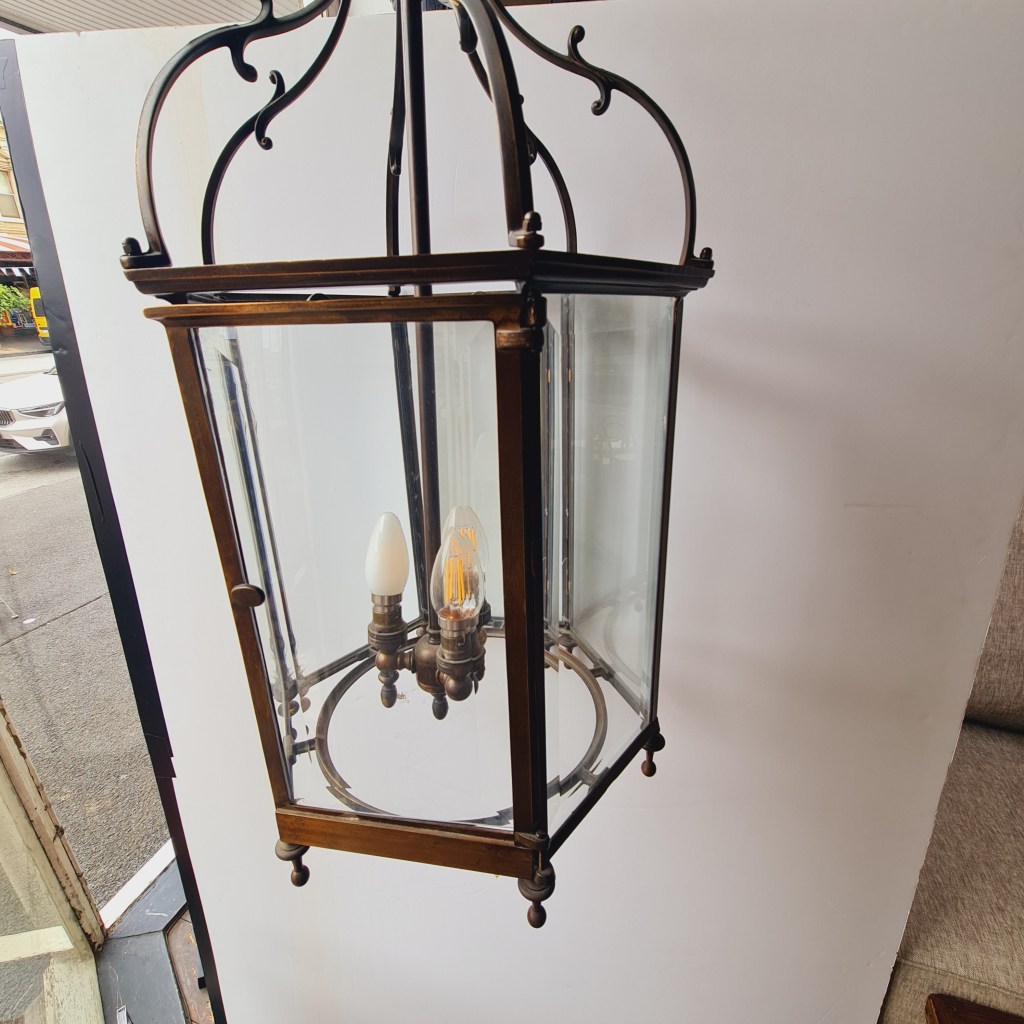 Bronze framed lantern in the classical style. Not dissimilar to the fine hallway and verandah light produced by Jamb of London. This is quite heavy and supported by strong original chain and ceiling rose. 70 cm high and 35 cm diameter. $590.