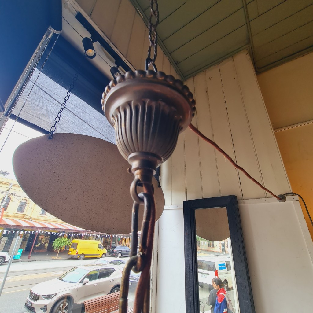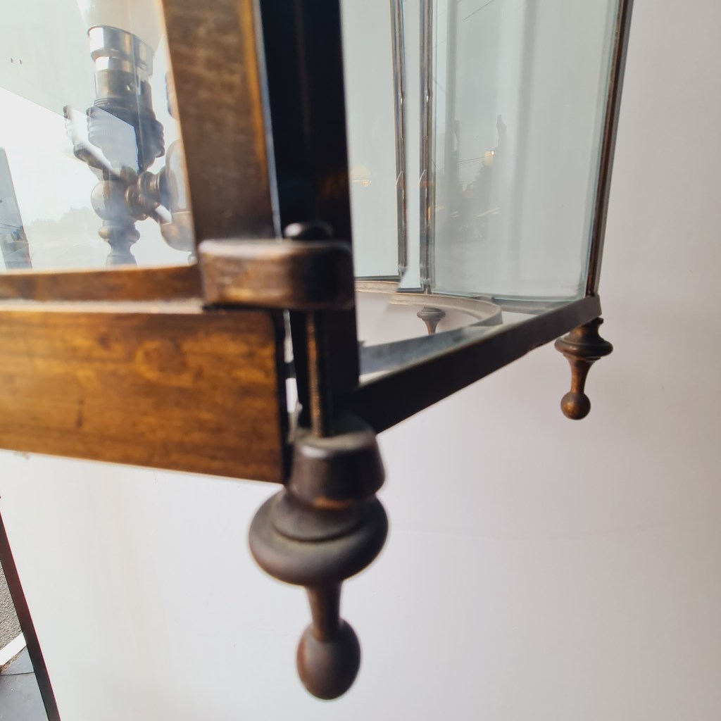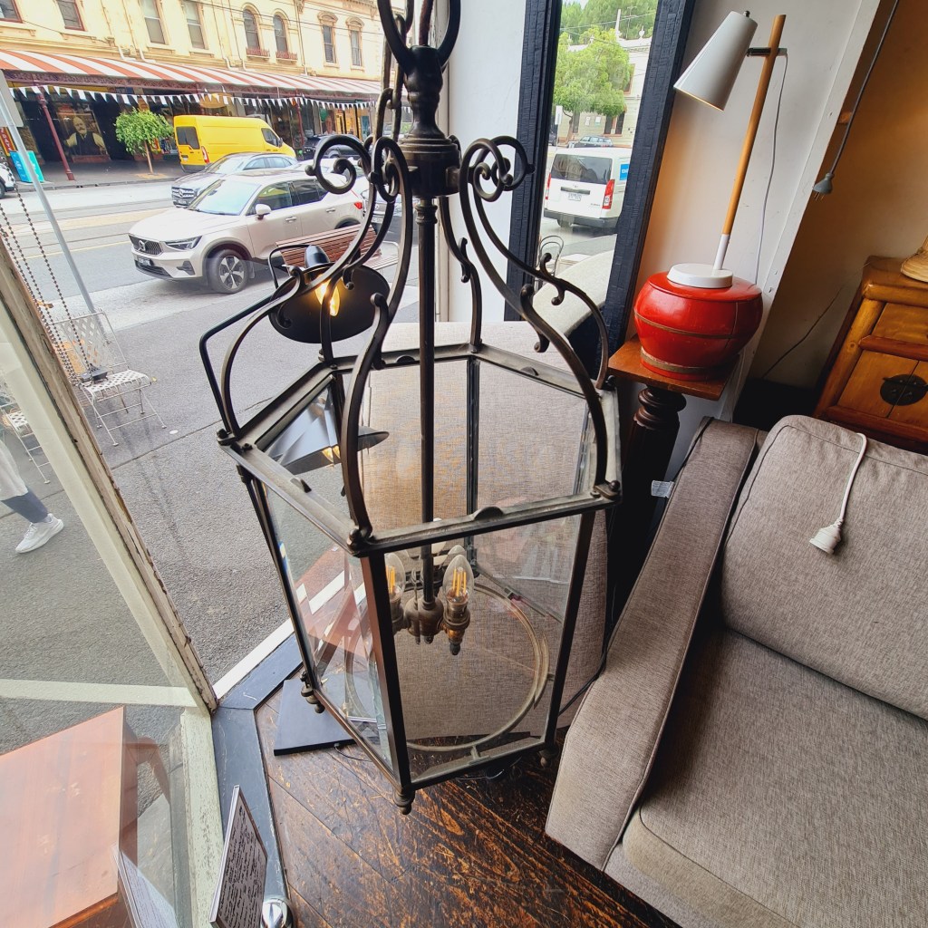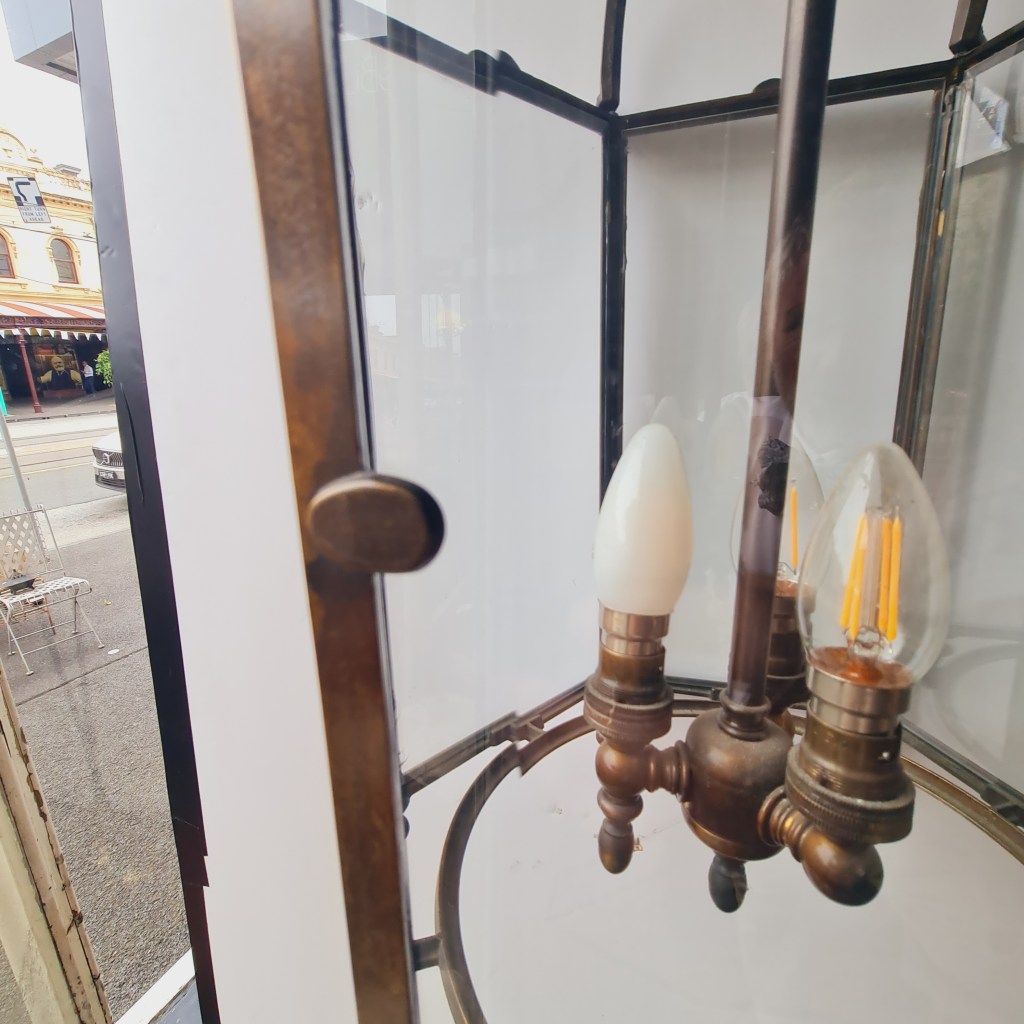 Bronze framed lantern in the classical style. Not dissimilar to the fine hallway and verandah light produced by Jamb of London. This is quite heavy and supported by strong original chain and ceiling rose. 70 cm high and 35 cm diameter. $590.