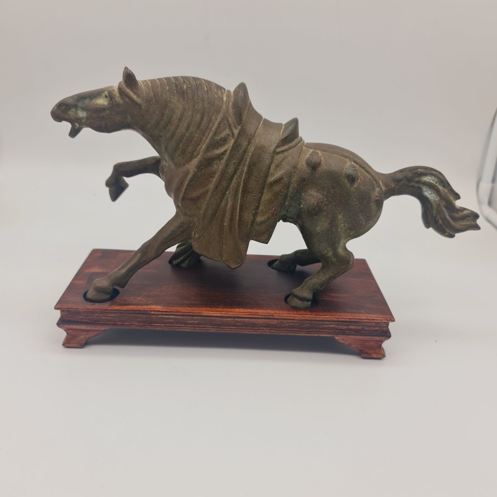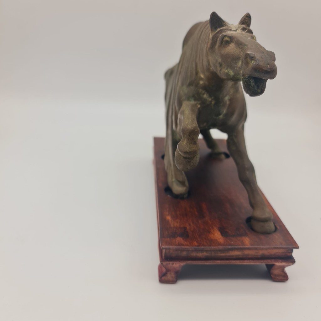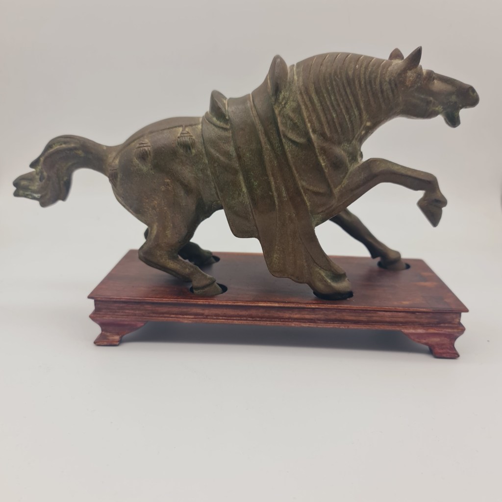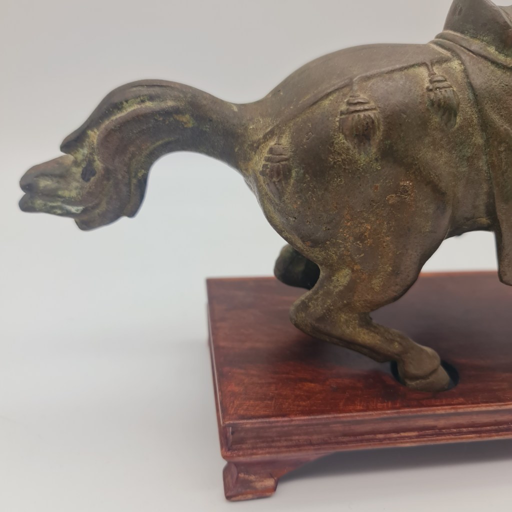 Tang Dynasty style brass horse on rosewood stand. In this owner’s possession for over 50 years. Please feel free to submit any questions if you are not able to inspect in South Melbourne. 19 cm high x 29 cm long and 9 cm deep. $490.