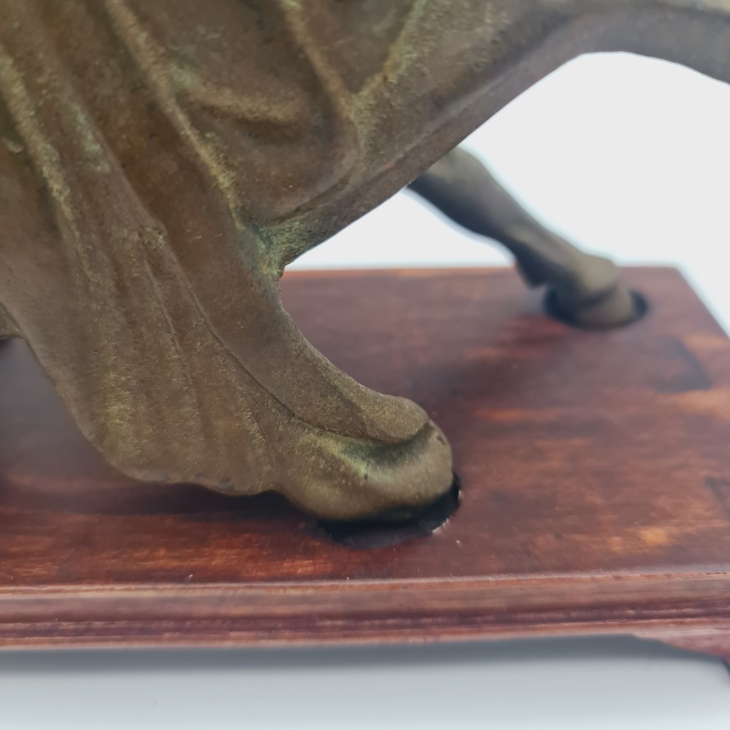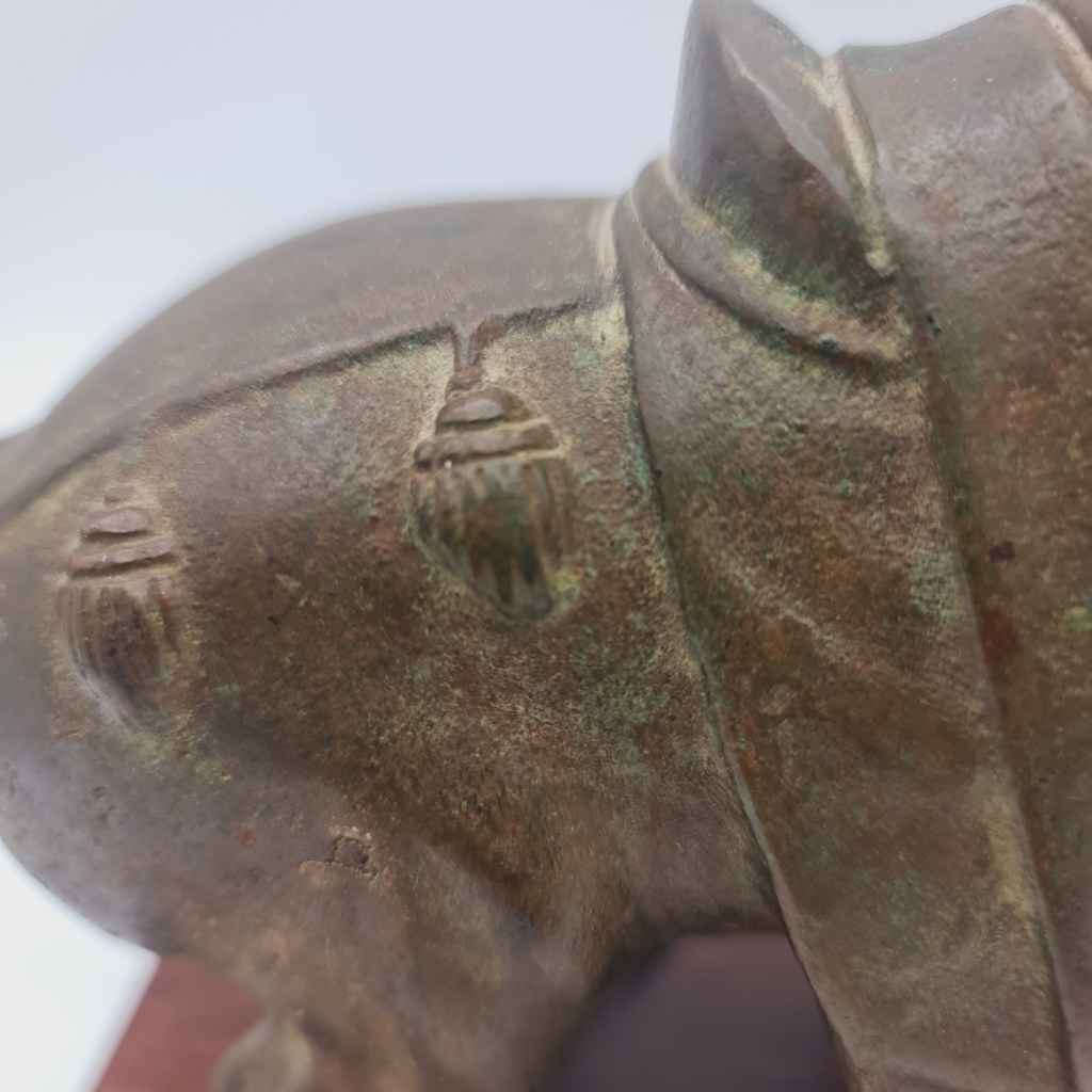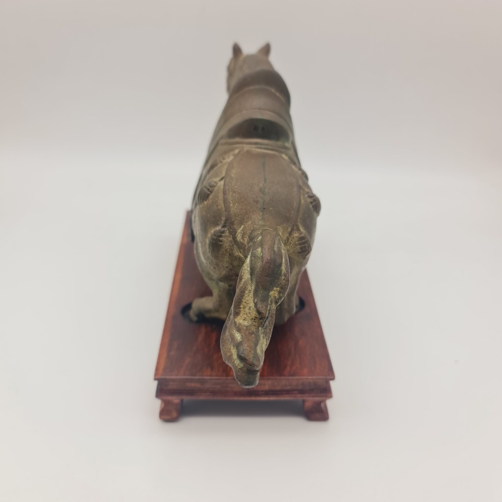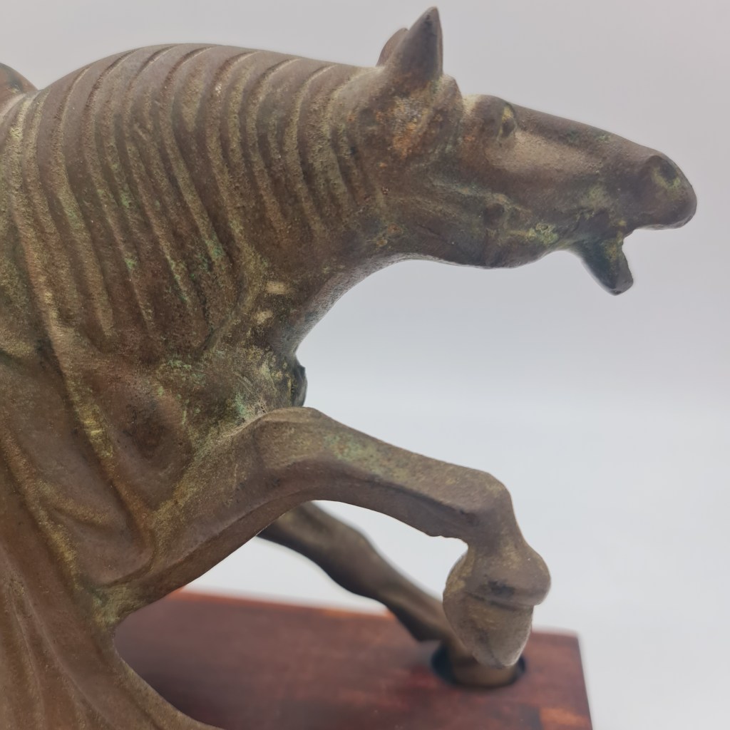 Tang Dynasty style brass horse on rosewood stand. In this owner’s possession for over 50 years. Please feel free to submit any questions if you are not able to inspect in South Melbourne. 19 cm high x 29 cm long and 9 cm deep. $490.