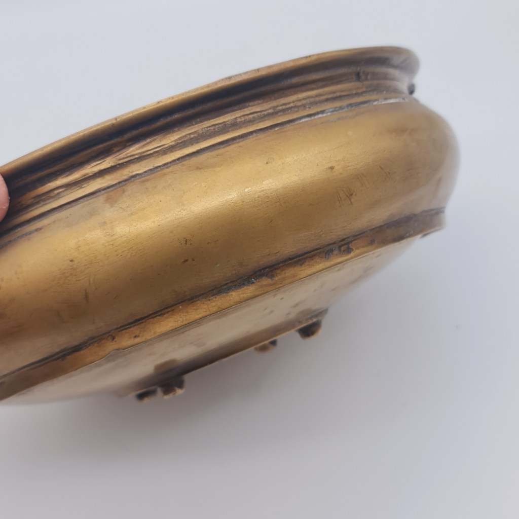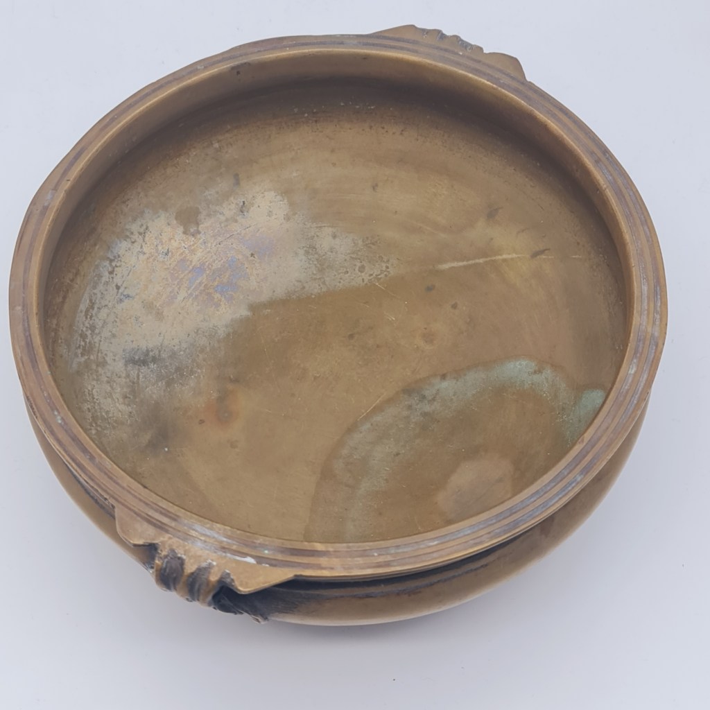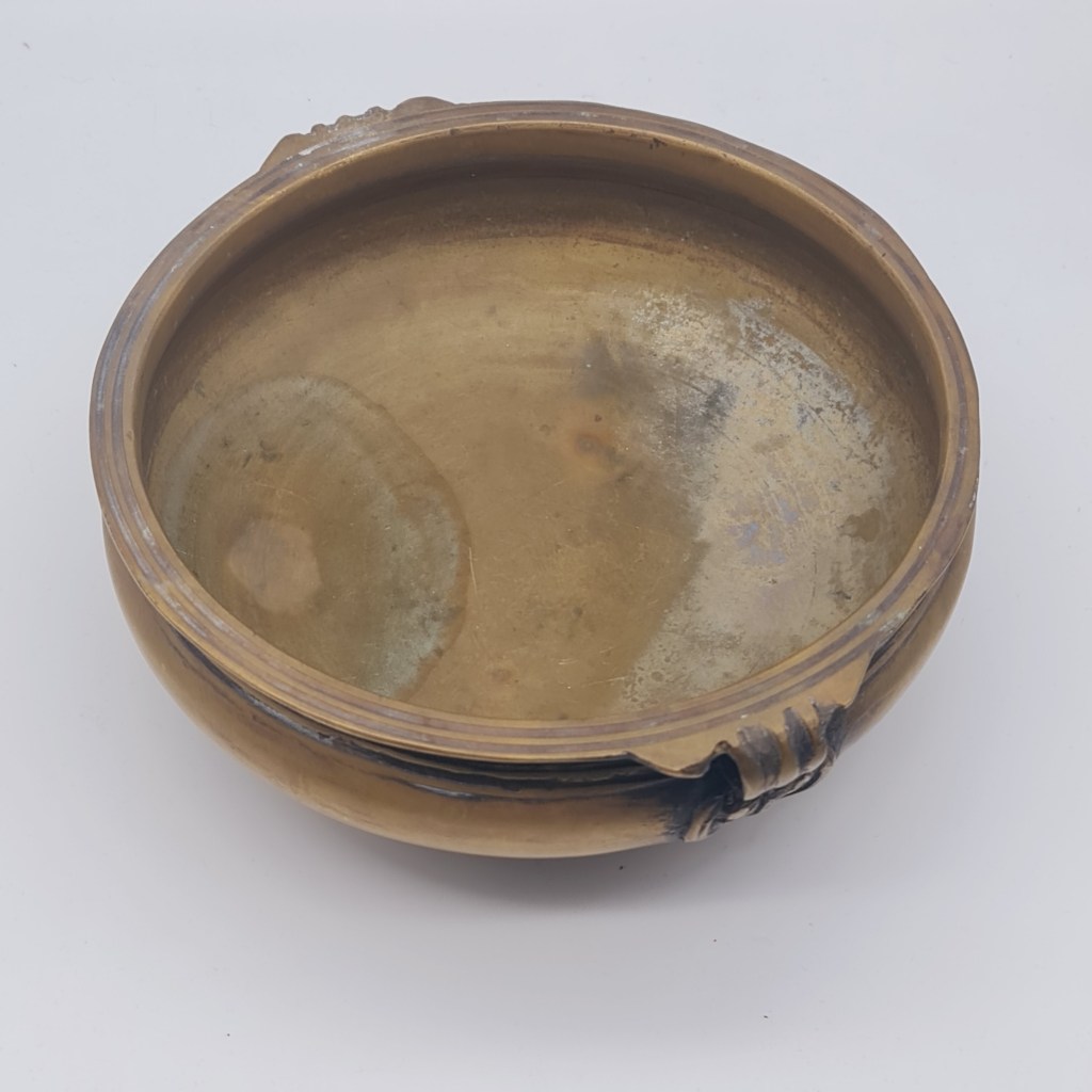 Indian temple brass bowl from the 18th (possibly early 19th) century. Extremely heavy and sitting on four small bun feet. We suggest that this would have held sacred water in a place of worship. There is a very distinctive and reasonant note when th ebowl is struck with a solid object. These objects have also been extremely sought after through history. 10 cm high x 28 cm diameter. Price is $750.