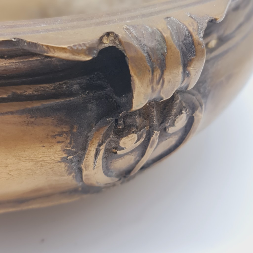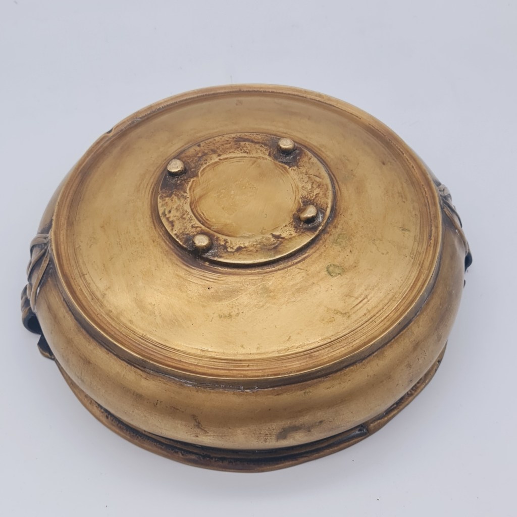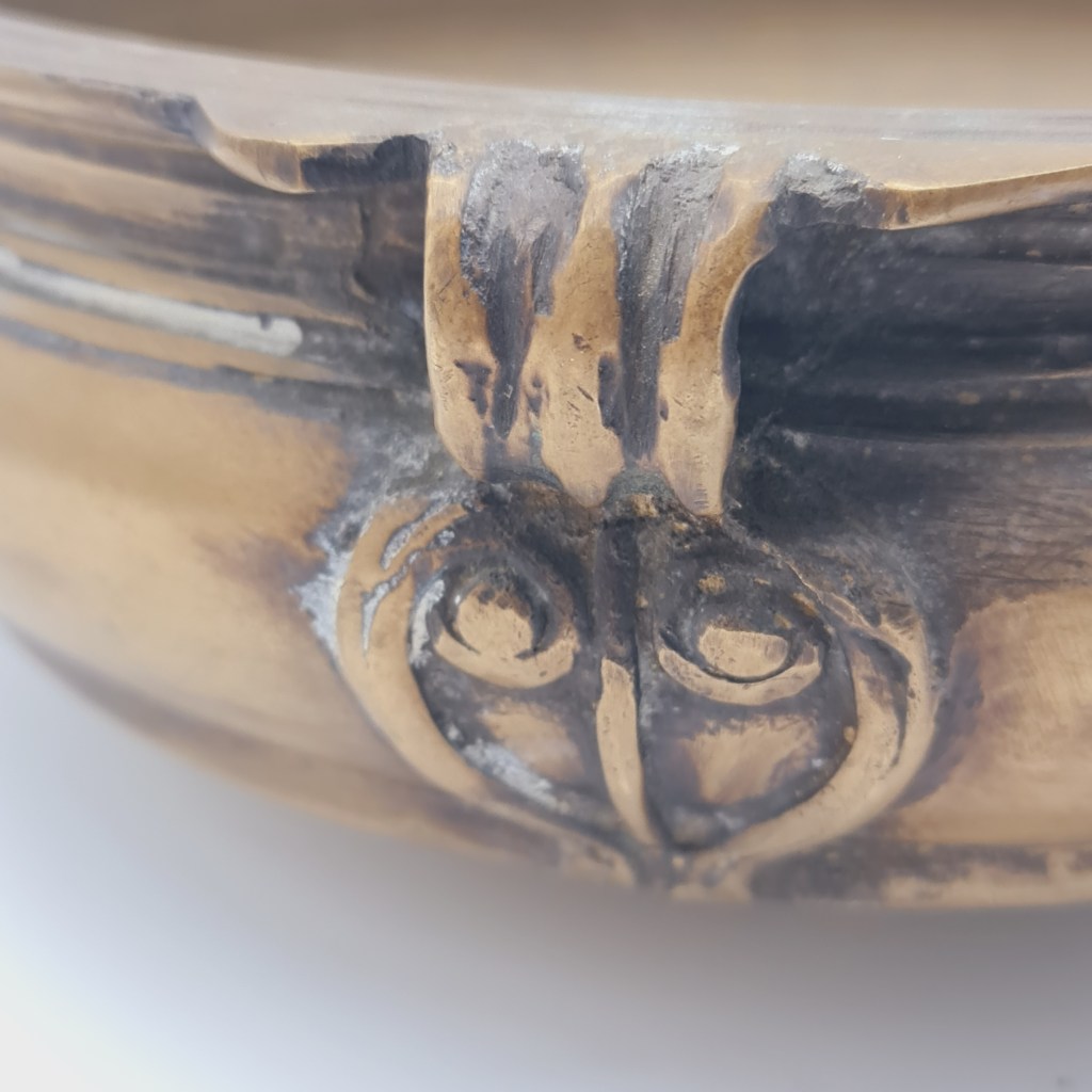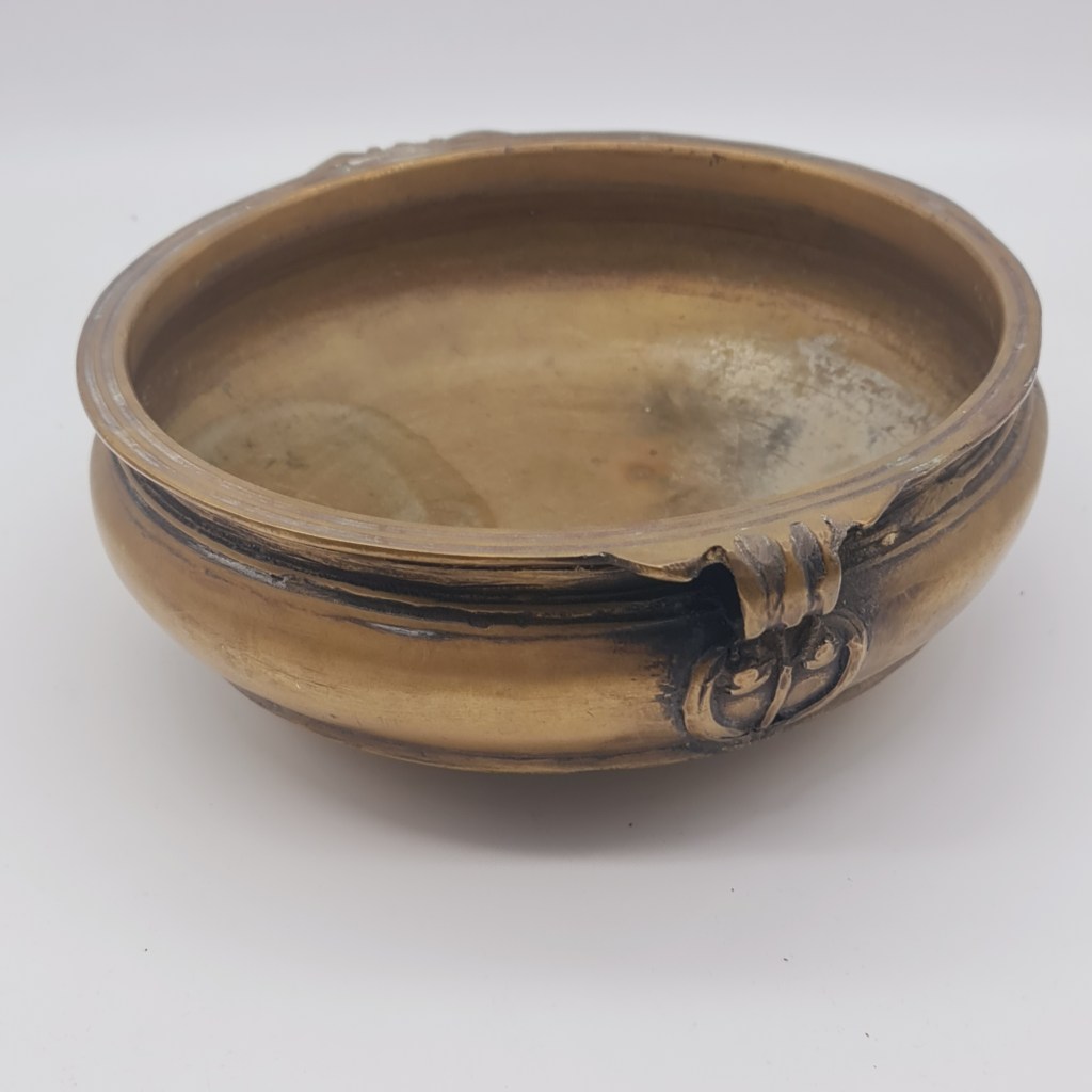 Indian temple brass bowl from the 18th (possibly early 19th) century. Extremely heavy and sitting on four small bun feet. We suggest that this would have held sacred water in a place of worship. There is a very distinctive and reasonant note when th ebowl is struck with a solid object. These objects have also been extremely sought after through history. 10 cm high x 28 cm diameter. Price is $750.