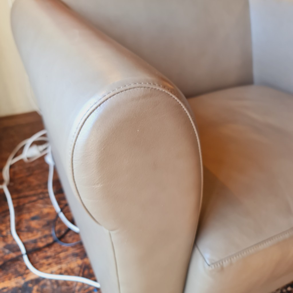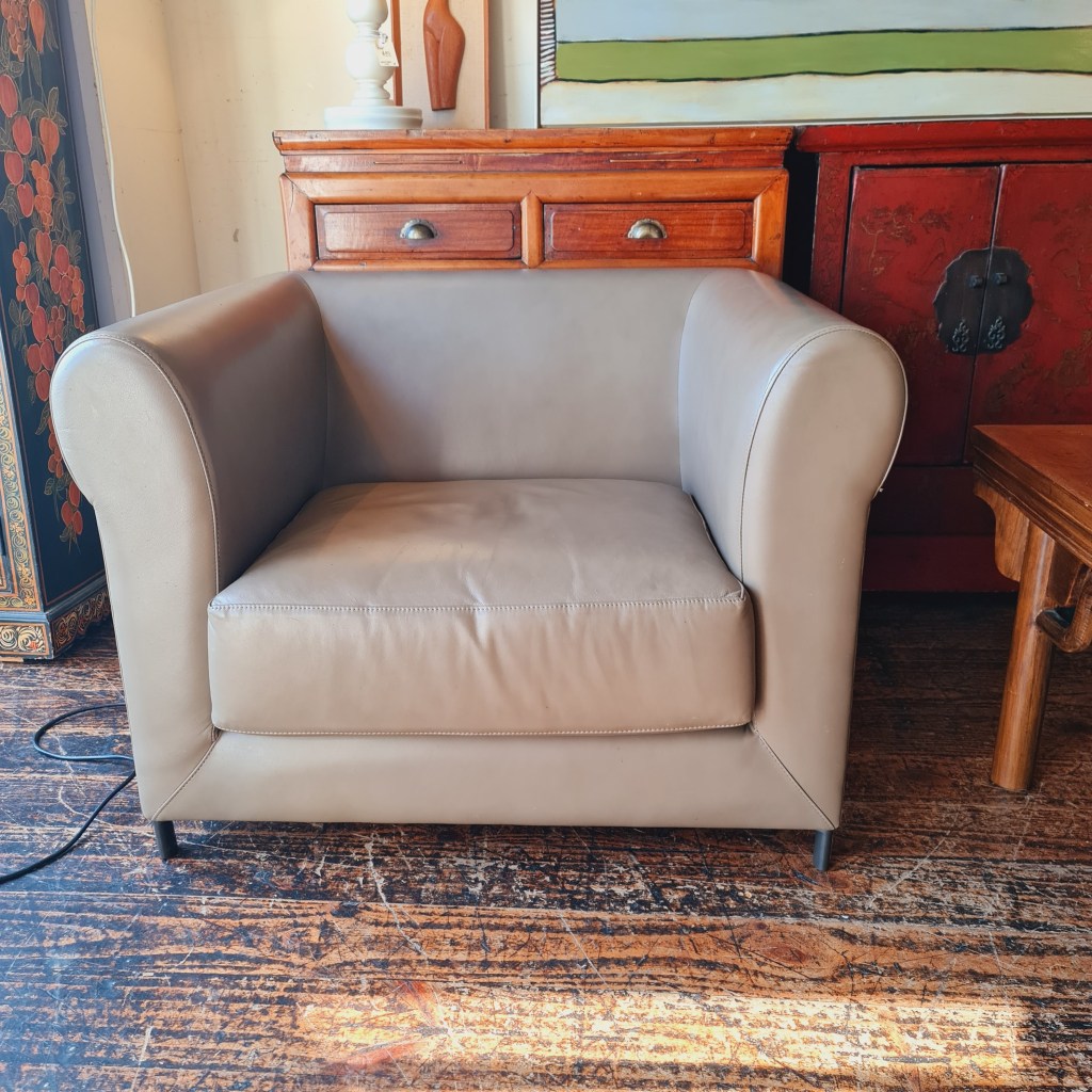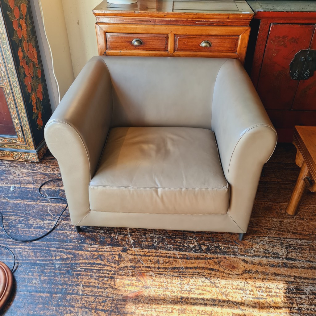 Leather armchair to be sold individually ( there is a long couch in this colour listed by us elsewhere). Overall in good, wellsprung condition. 70cm high x 93 cm wide and 85 cm deep. Price is $285.