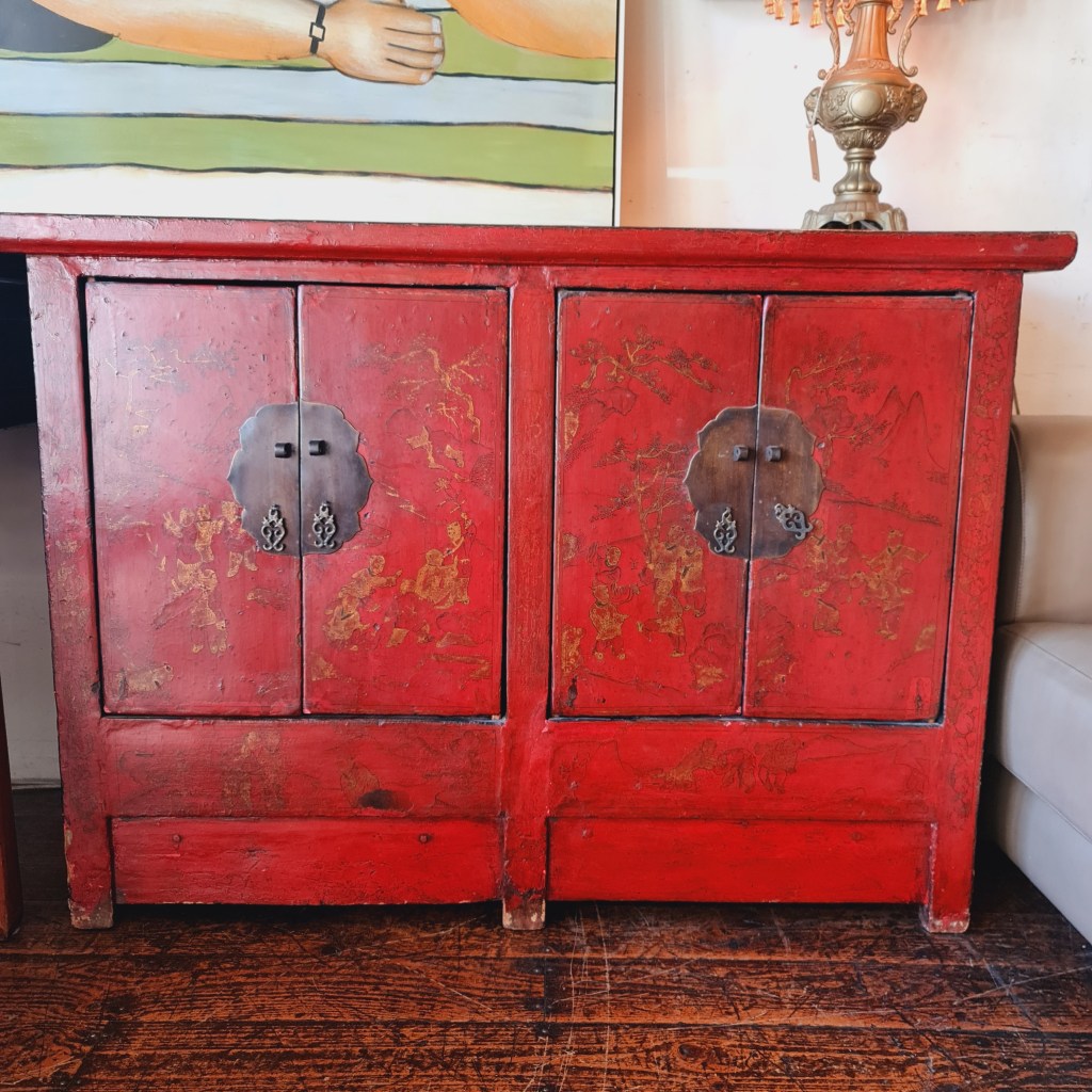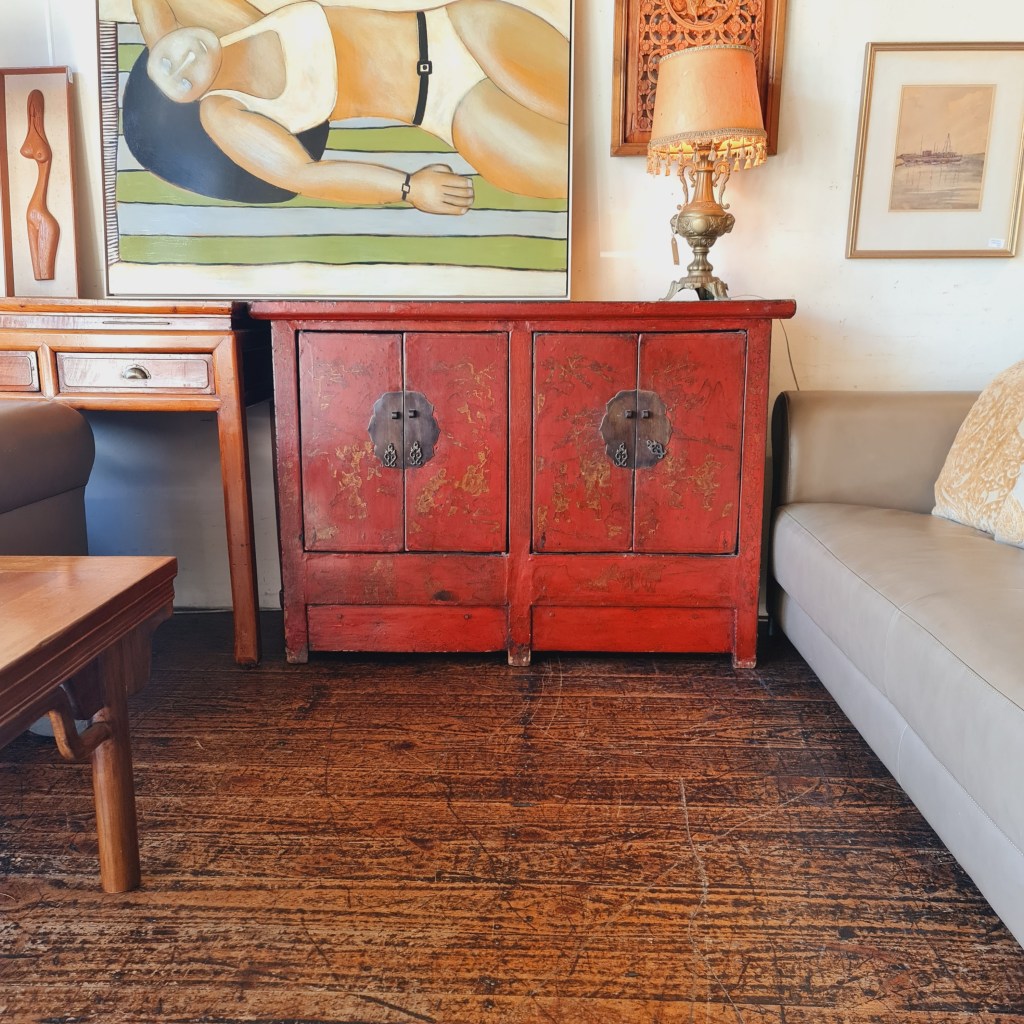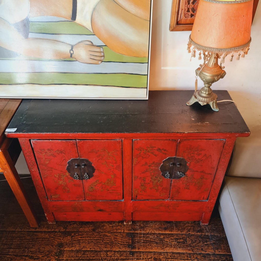 Red laquered cabinet in the Chinese antique style. Small drawers behind the doors which are painted with golden branches. 90 cm high x 128 cm wide and 42 cm deep. Price is $250.