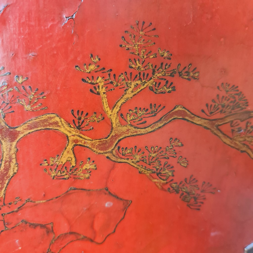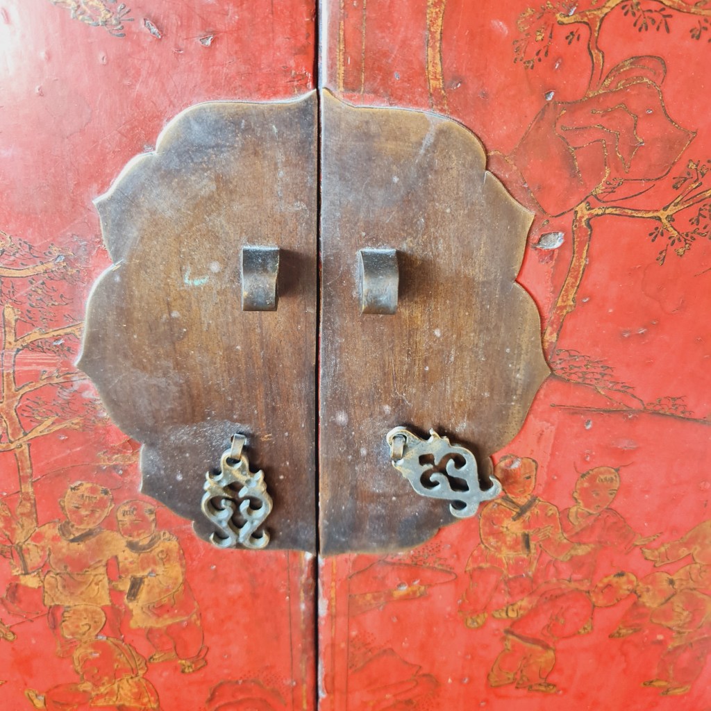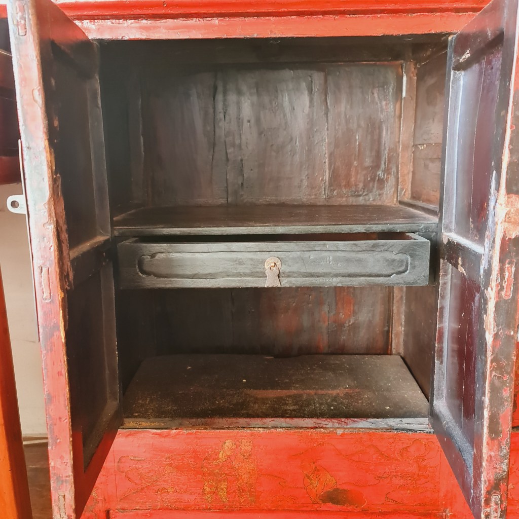 Red laquered cabinet in the Chinese antique style. Small drawers behind the doors which are painted with golden branches. 90 cm high x 128 cm wide and 42 cm deep. Price is $250.