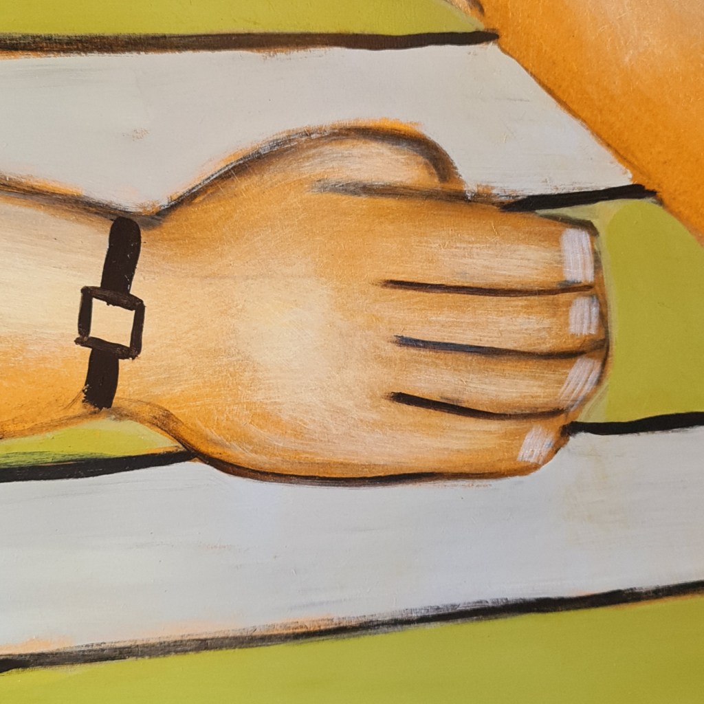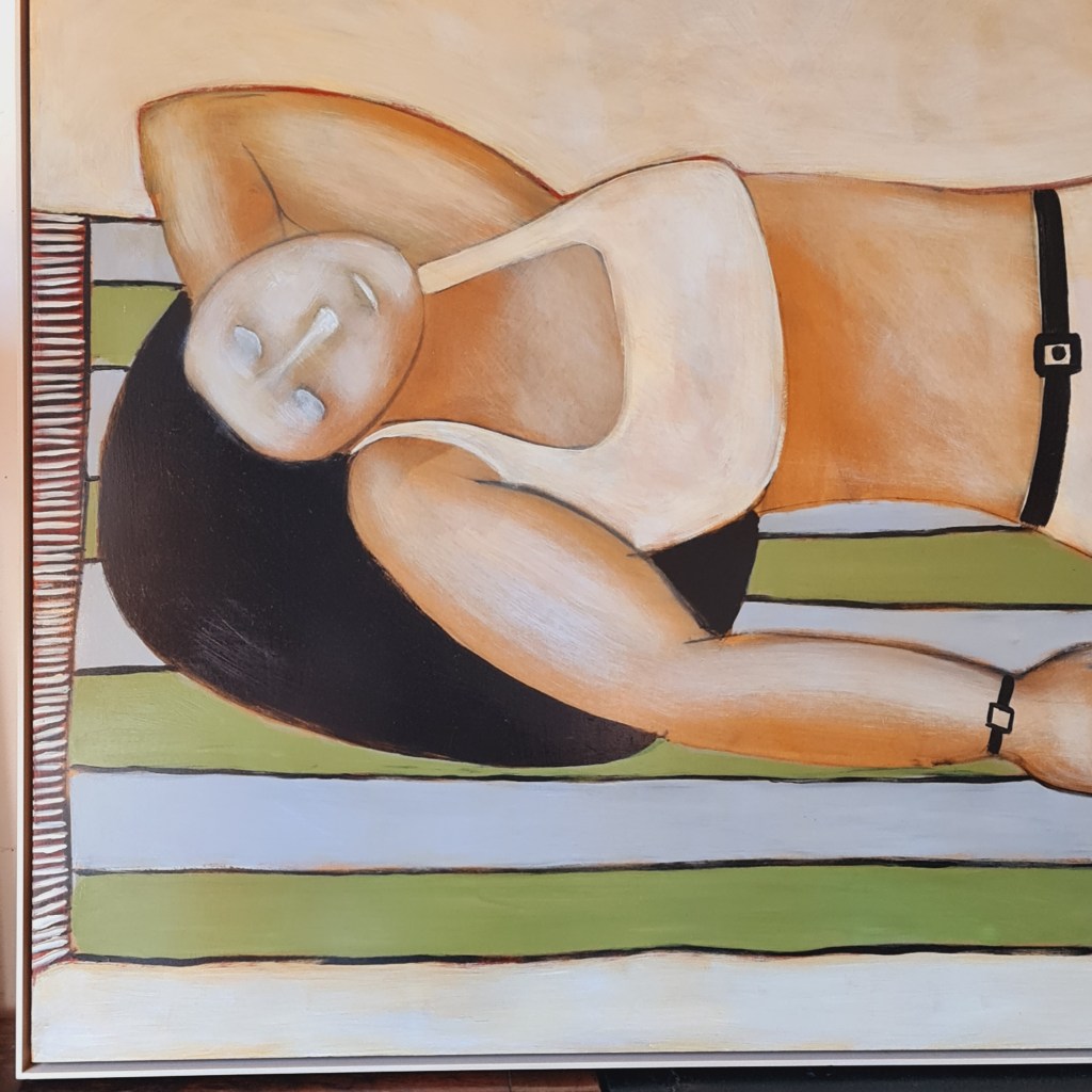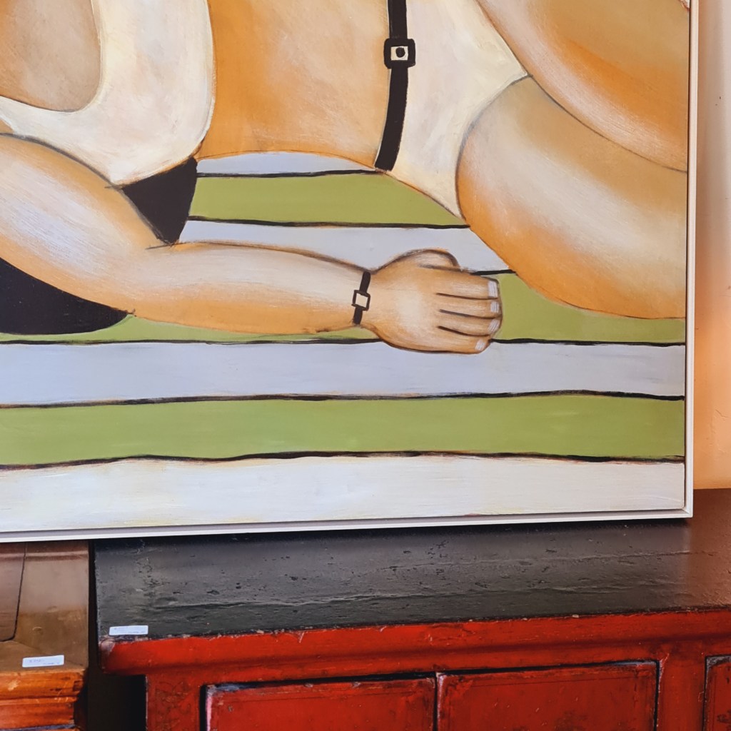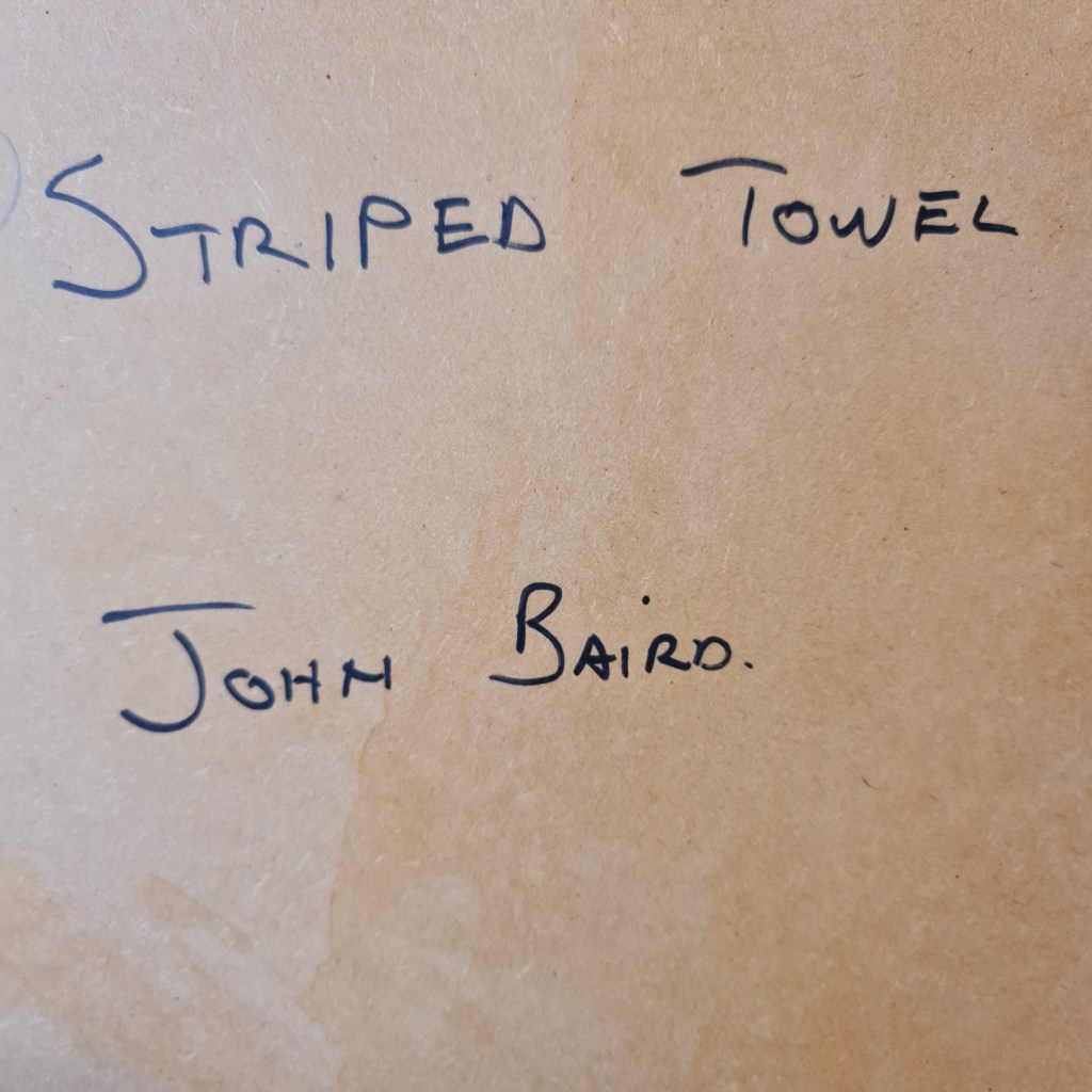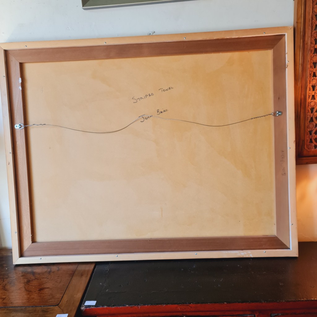 Large, framed, original painting by John Baird (1954 -),titled, Striped Towel. Mr Baird’s work has been recognised by the National Gallery of Victoria and his painting is represented in our State collection. Delivery within the Melbourne metro area is available and affordable. please ask for a quote. This painting is 98 cm x 125 cm and the price is $2,500.