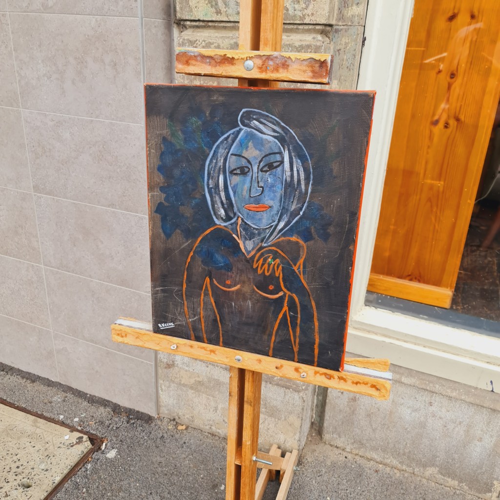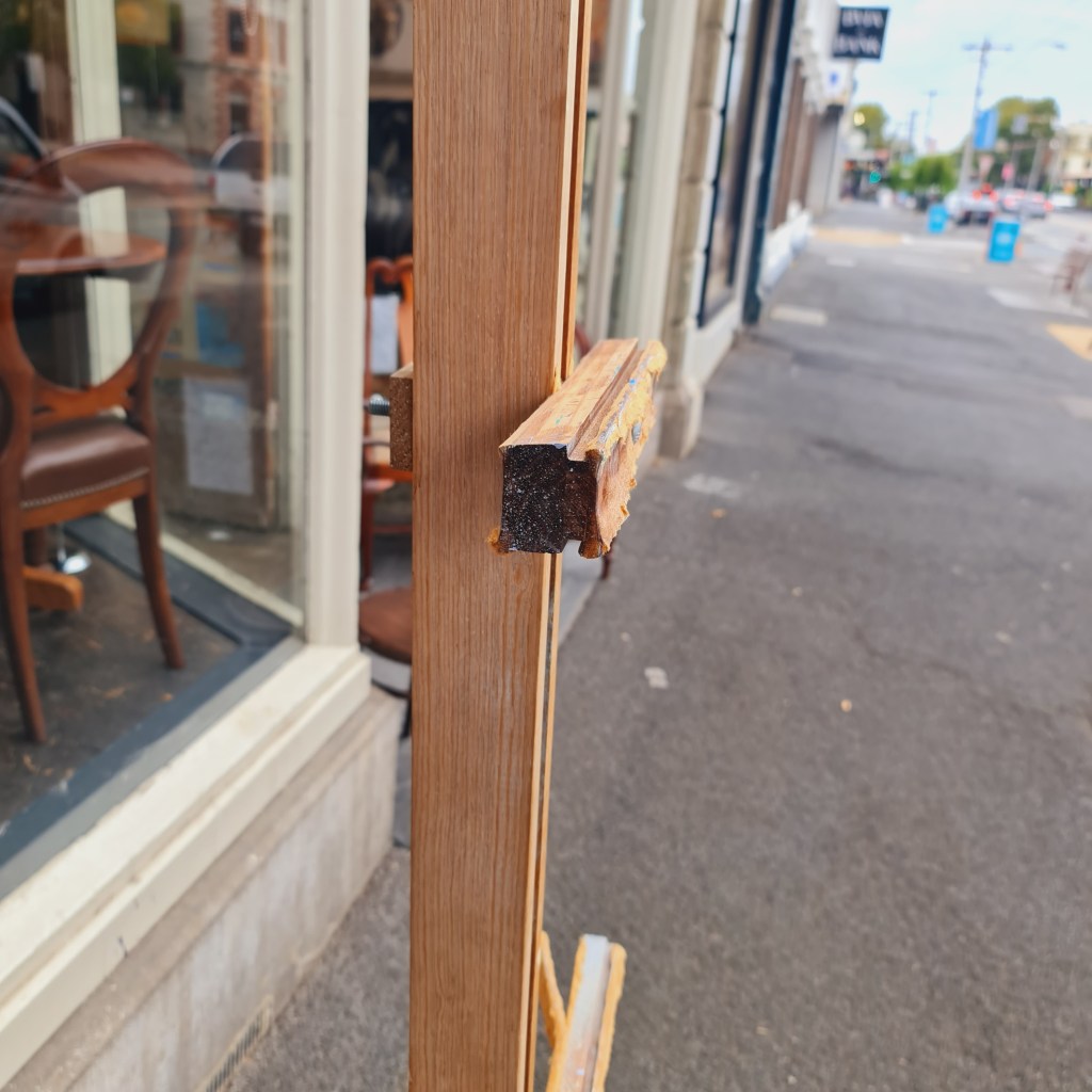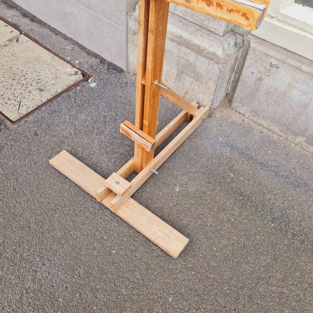 Clearly a home made easel, this artist’s accessory nonetheless does the job well. Holding the work securely for even the most vigorous painting technique. Very affordable for the student, a spare easel, or just display. $49. Stock No. 288.10