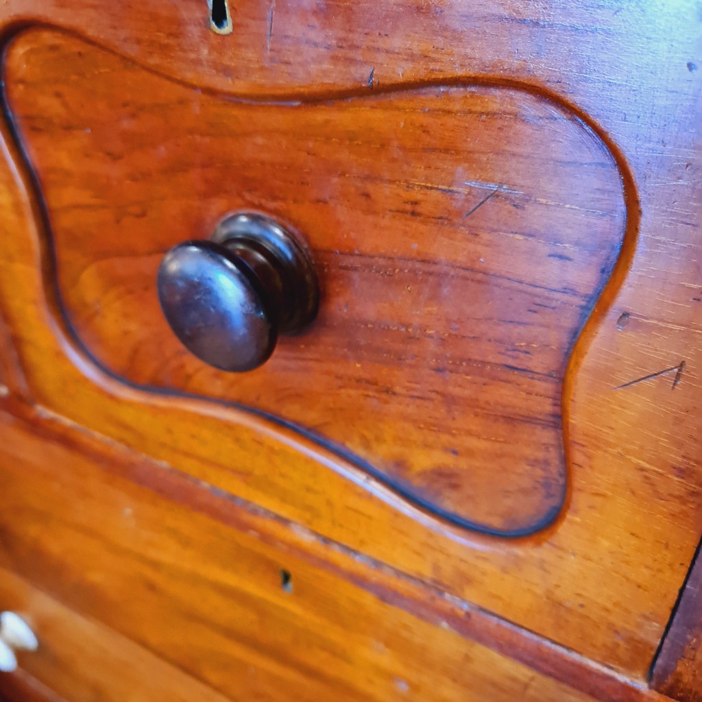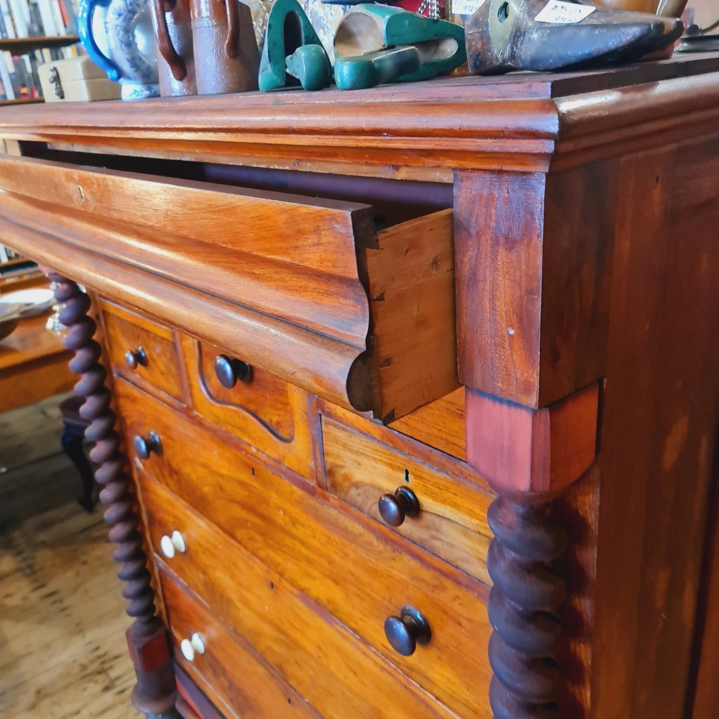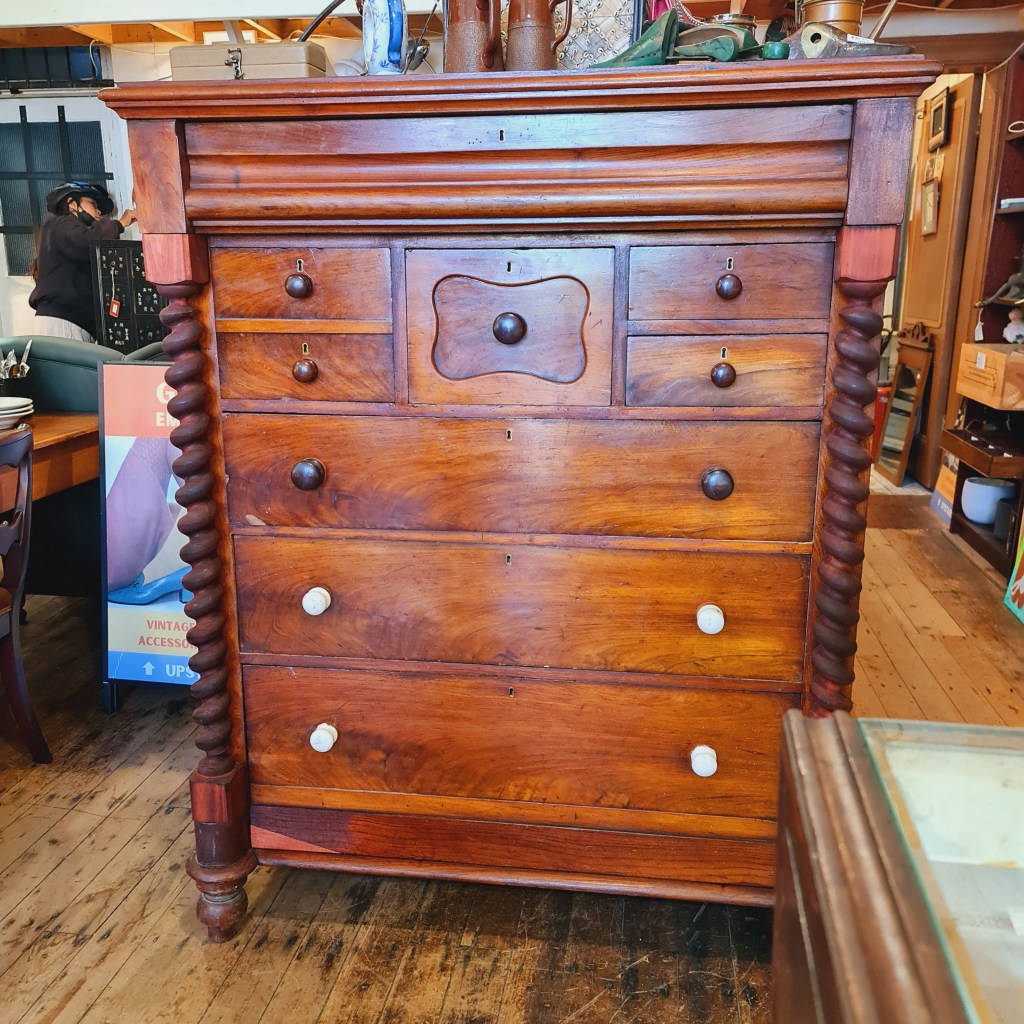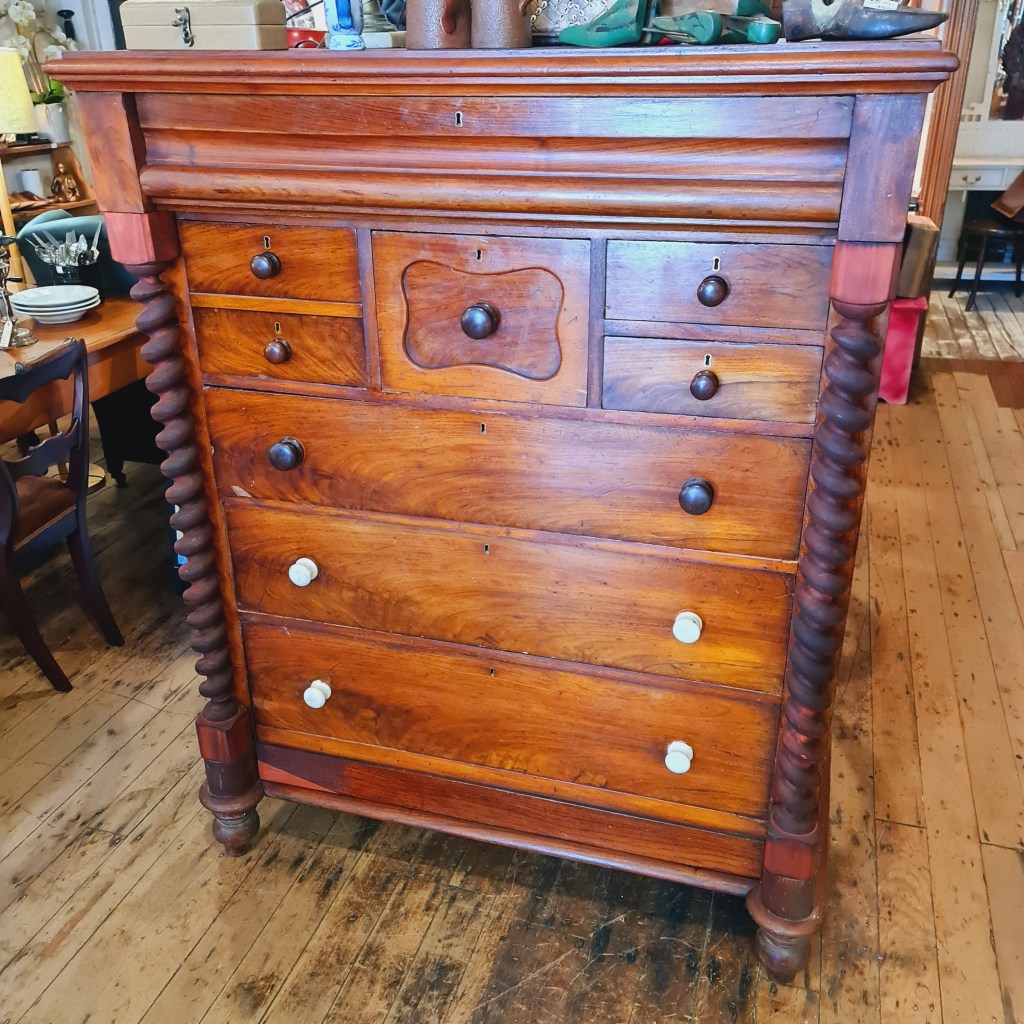 Very large chest of drawers from the late 1800’s. In working order there are superficial issues in the finish that make make this a good candidate for repainting. Fine to use as is.