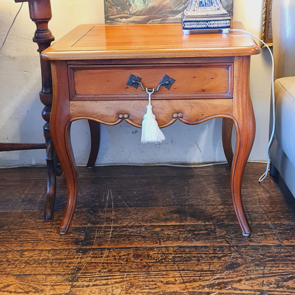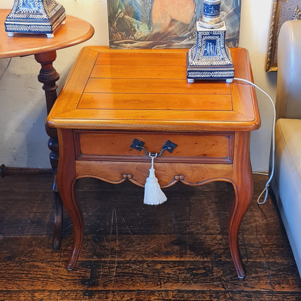 A single beside table in the French provincial style. Well made piece of generous proprtions with a drawer and cabriole legs. 56 c high and 60c square. $350. Stock #15507.3