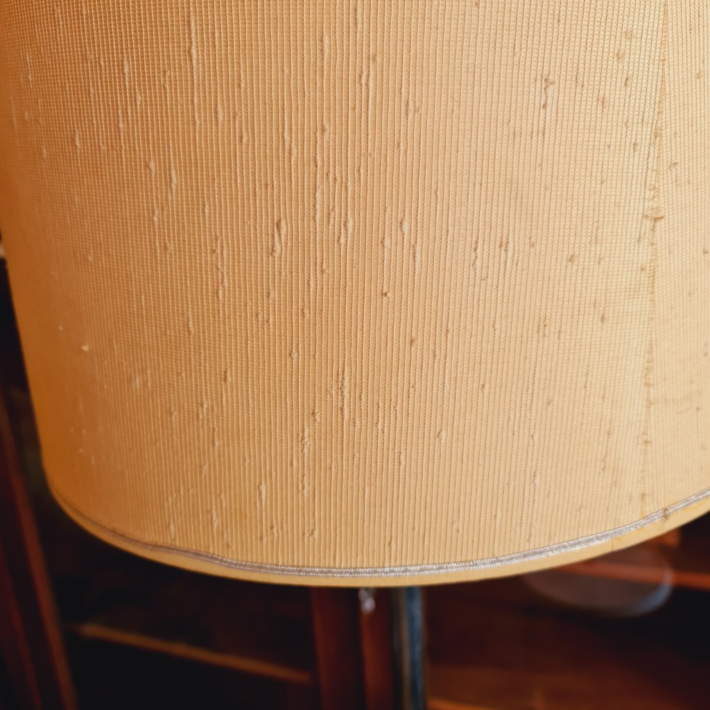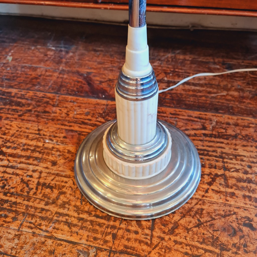 Standard lamp in the Deco style of the 20’s, most likely made about 20 years later. Original diffuser bowl, bakelite fittings and parts to re-instate the matchbox holder should you wish to re-create the full cigarette picture. There is some fraying at the top of the shade (see photograph). We feel this could be secured and have left it as is. 166 c high and approx 40 c diameter. $295. Stock #15505.01