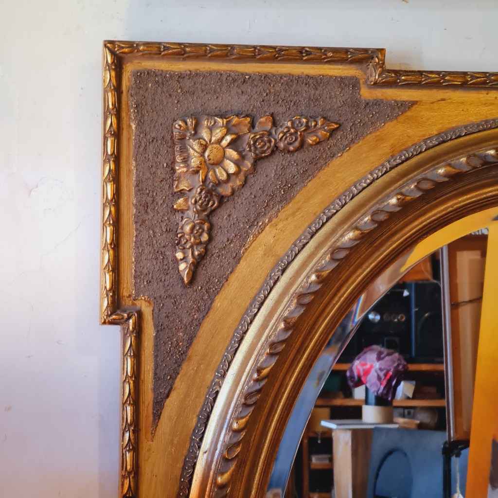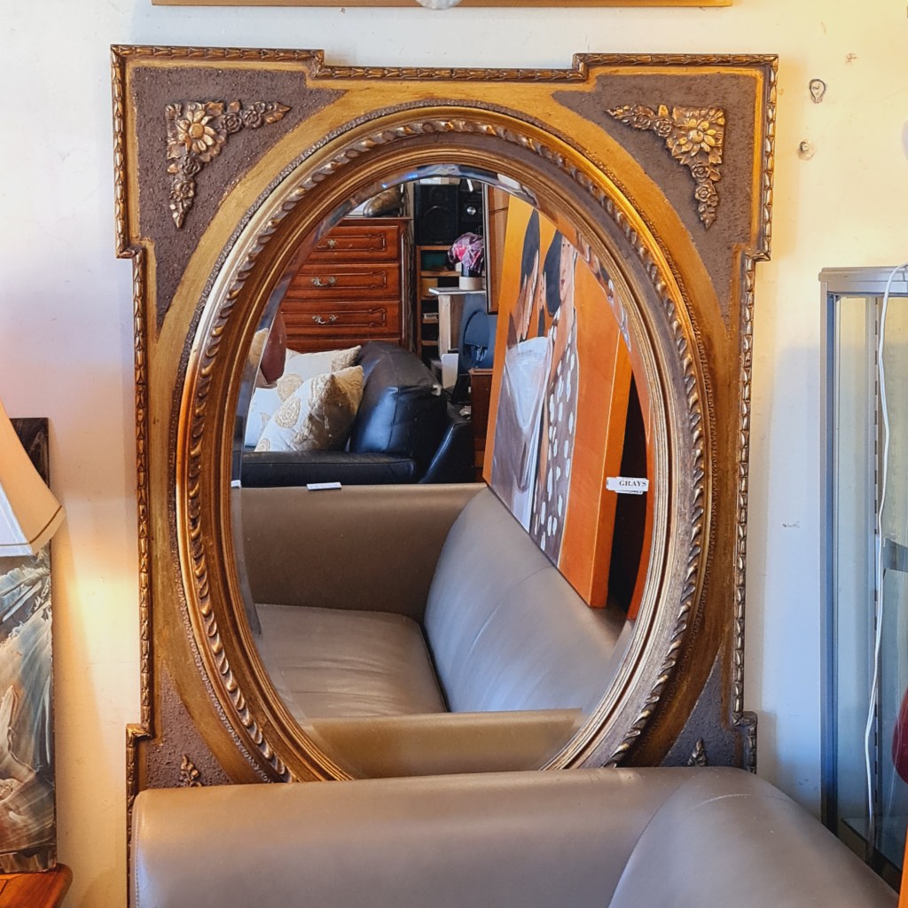 A gilt mirror in the baroque style with bevel edged glass. This is a reproduction piece with no faults to mention despite the fact that we have hidden the bottom half behind that couch ib=n the photographs. 120 c high and 90 c wide. $345. Stock #15498.2