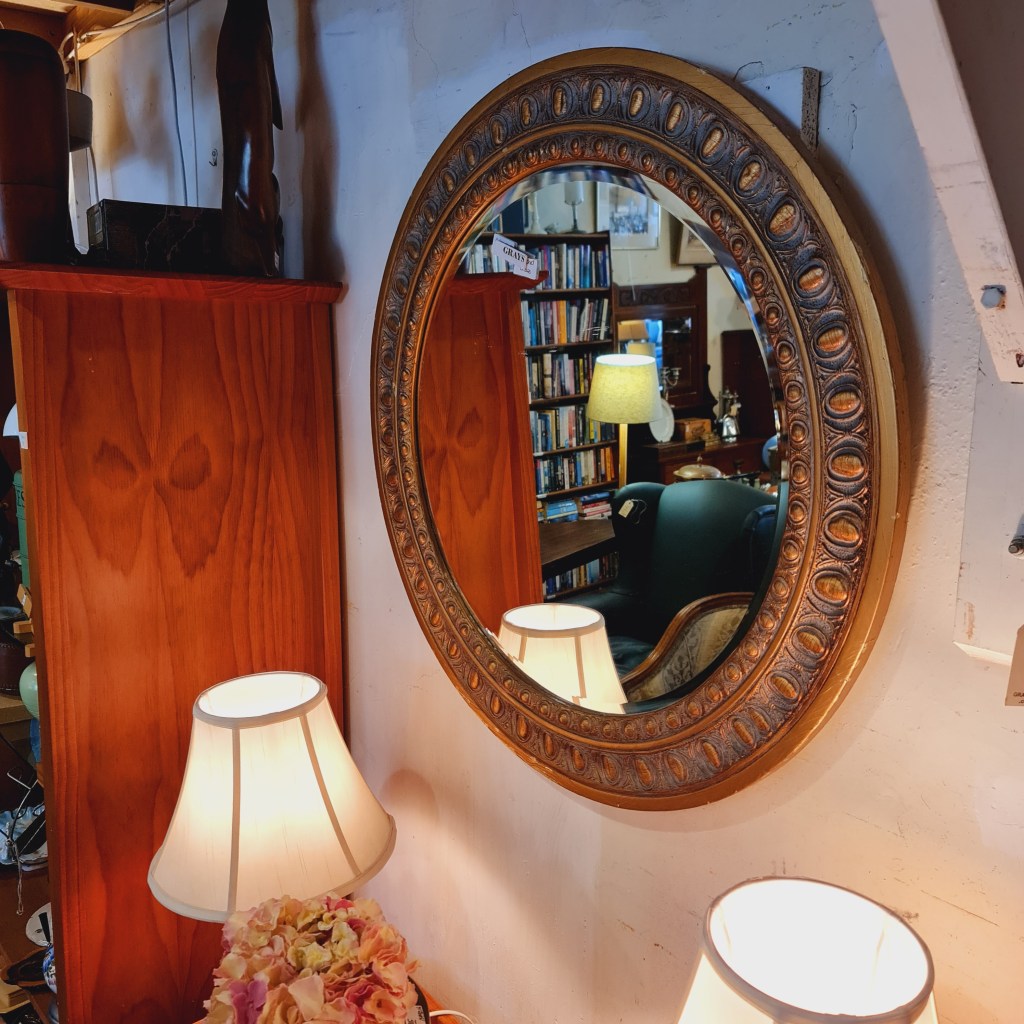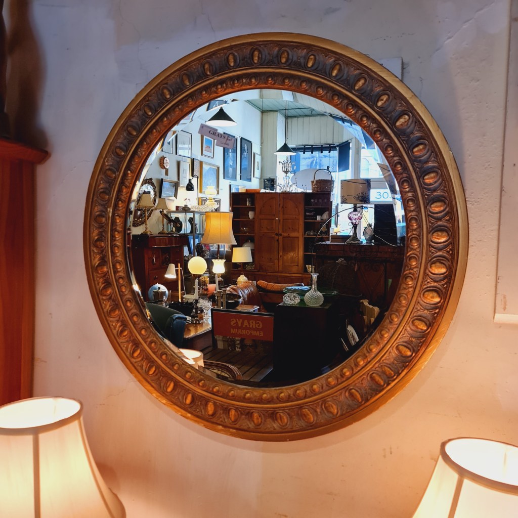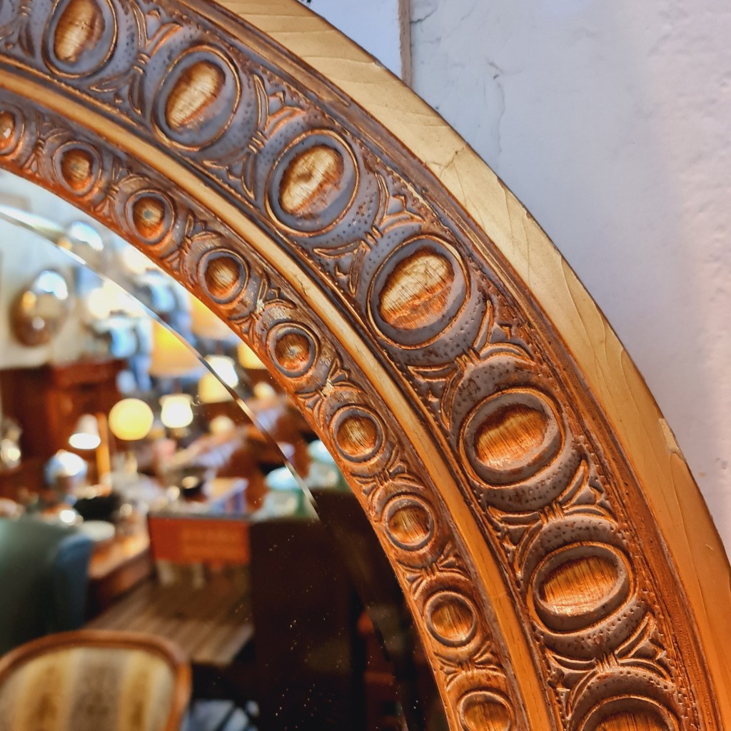 Round flat gilt framed mirror. This mirror does have some surface scratches over approx a 5 cm square area on the upper left. They are proving hard to highlight in a photograph and in this instance, may have to be inspected in person. 79 cm diameter. $160. Stock #15203.1