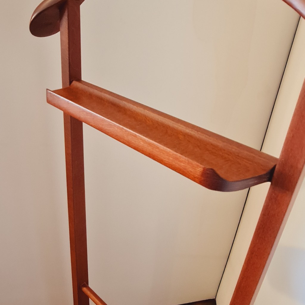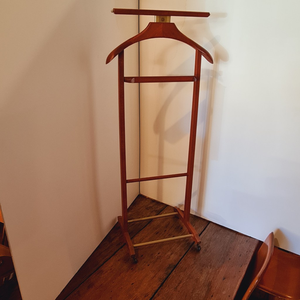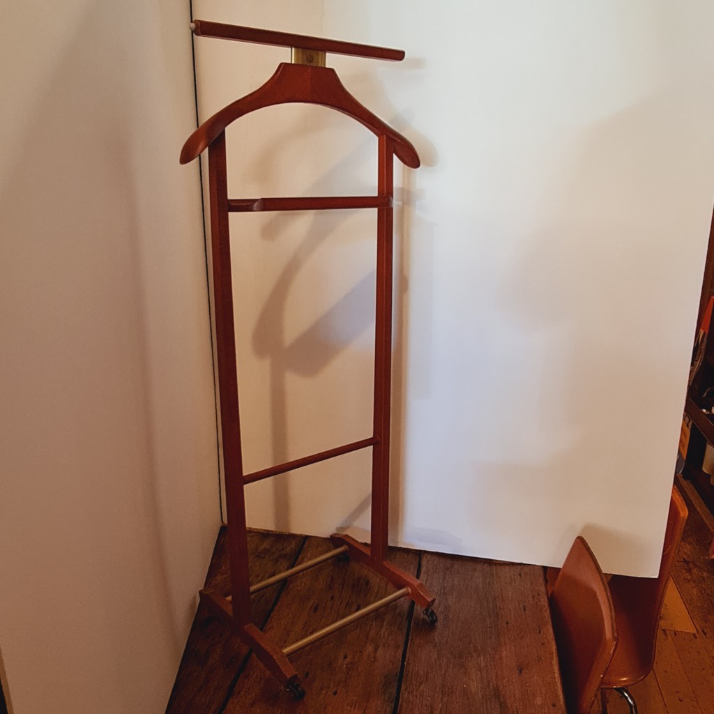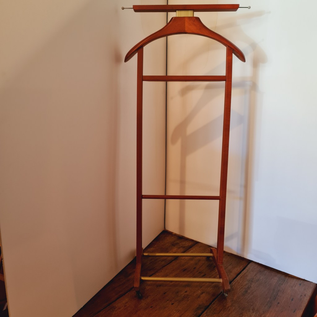Italian made clothing valet made around 1970. Excellent condition. A compact way to prepare store and display your garments for the day. 106 c high x 46 c wide and 24 c deep at the base. $290