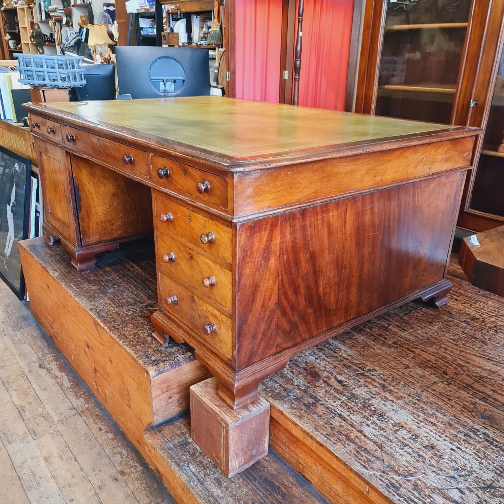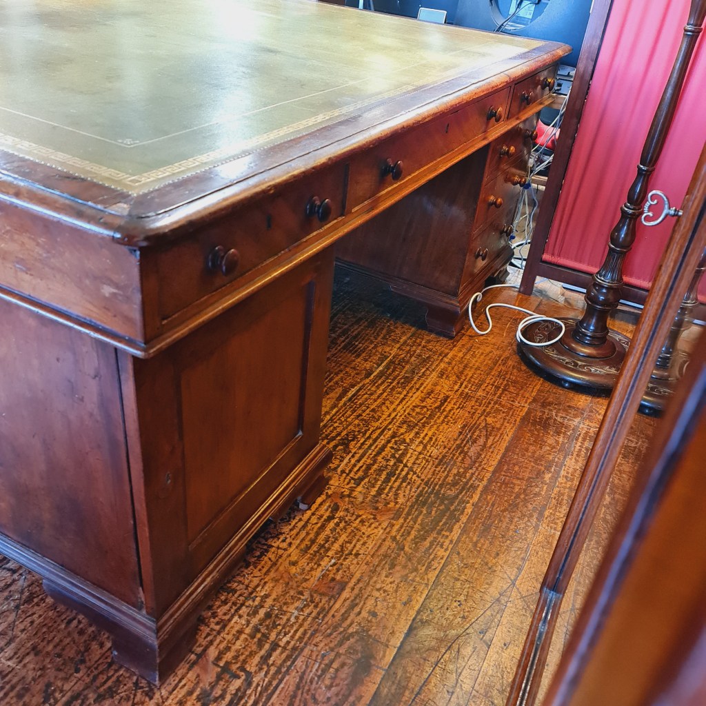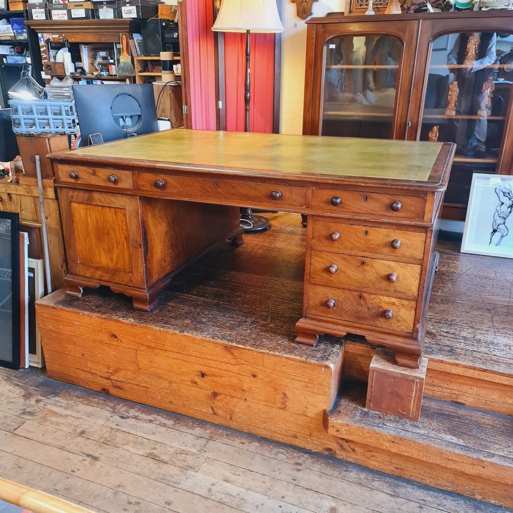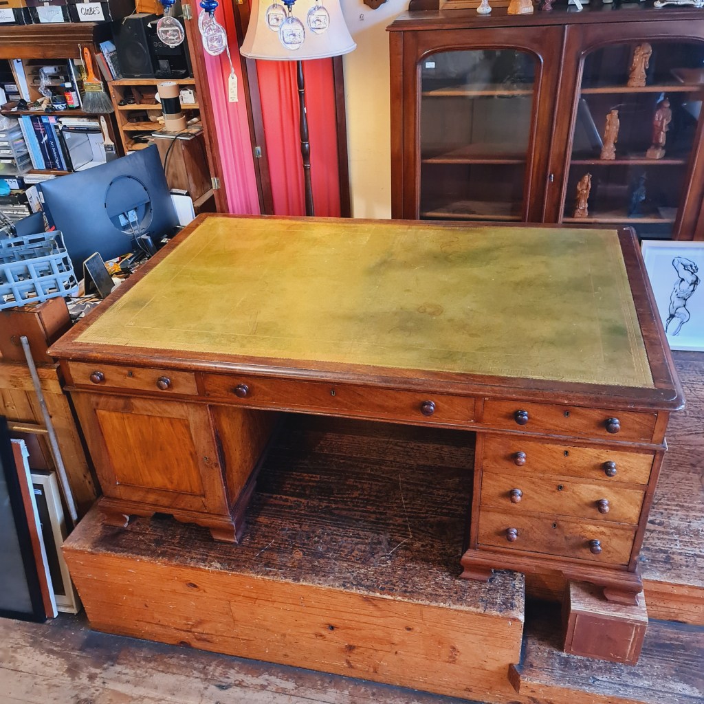 Victorian double sided partner’s desk with leather top in cedar. This impressive desk separates for transport and we deliver most Saturdays in the metro area. 77 c high x 183 x 124. $1,500.