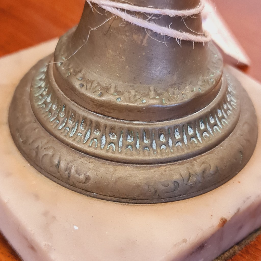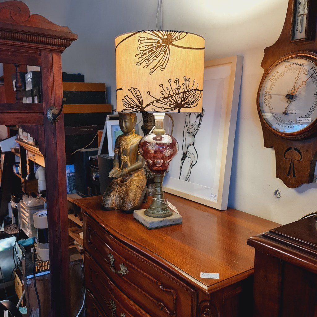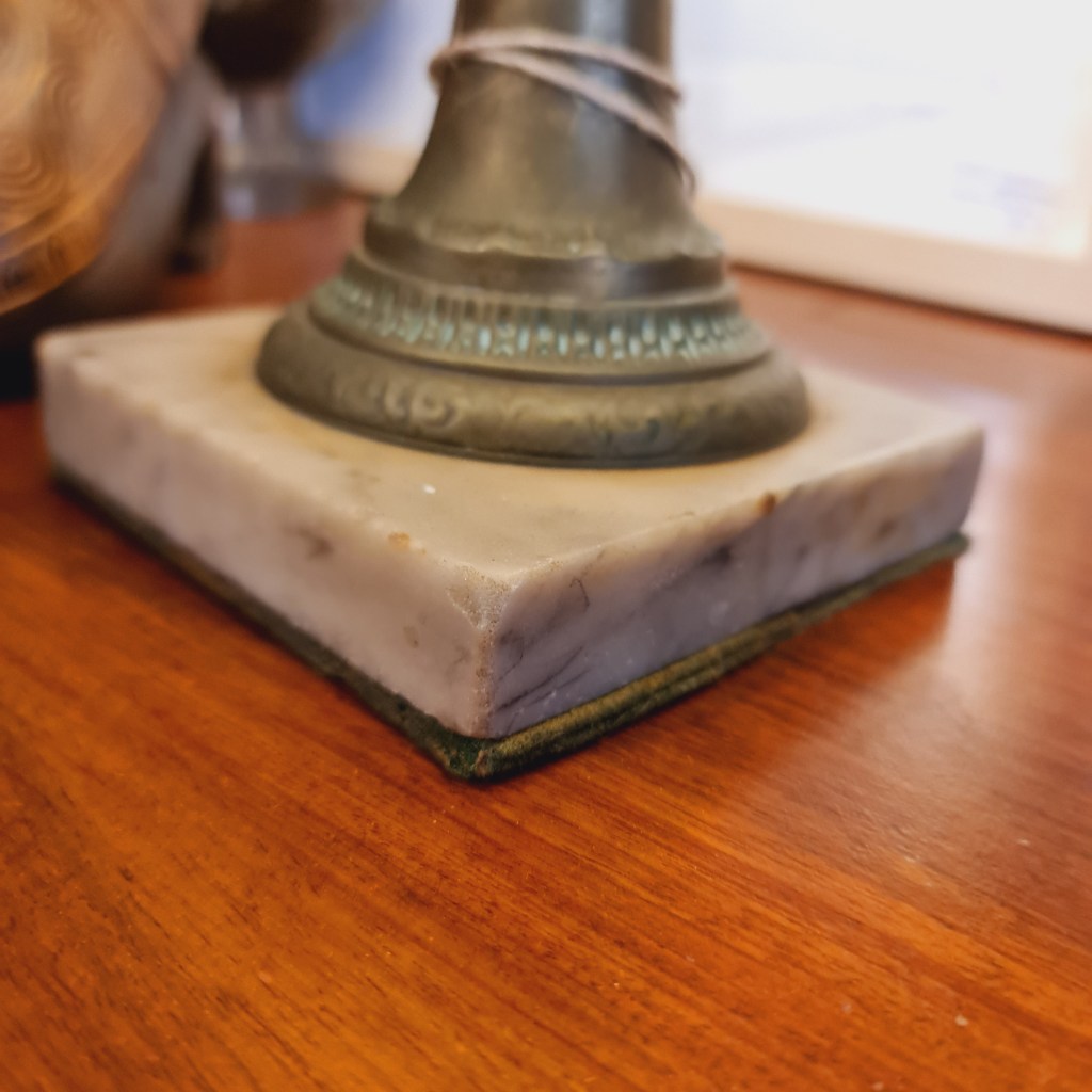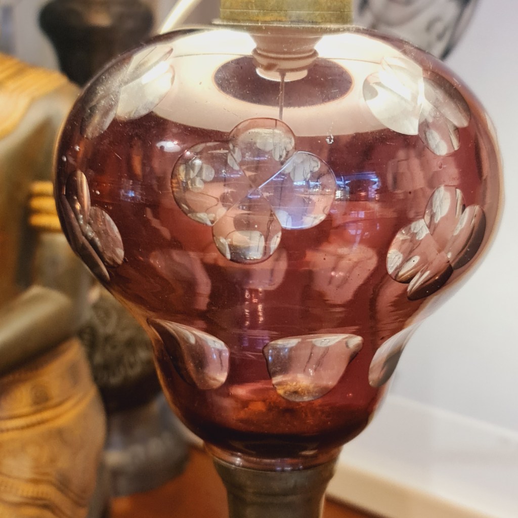 Antique amethyst glass table lamp with later shade. Supported by a brass vase shaped column standing on an onyx base. 55 cm high and 26 cm diameter. $185.