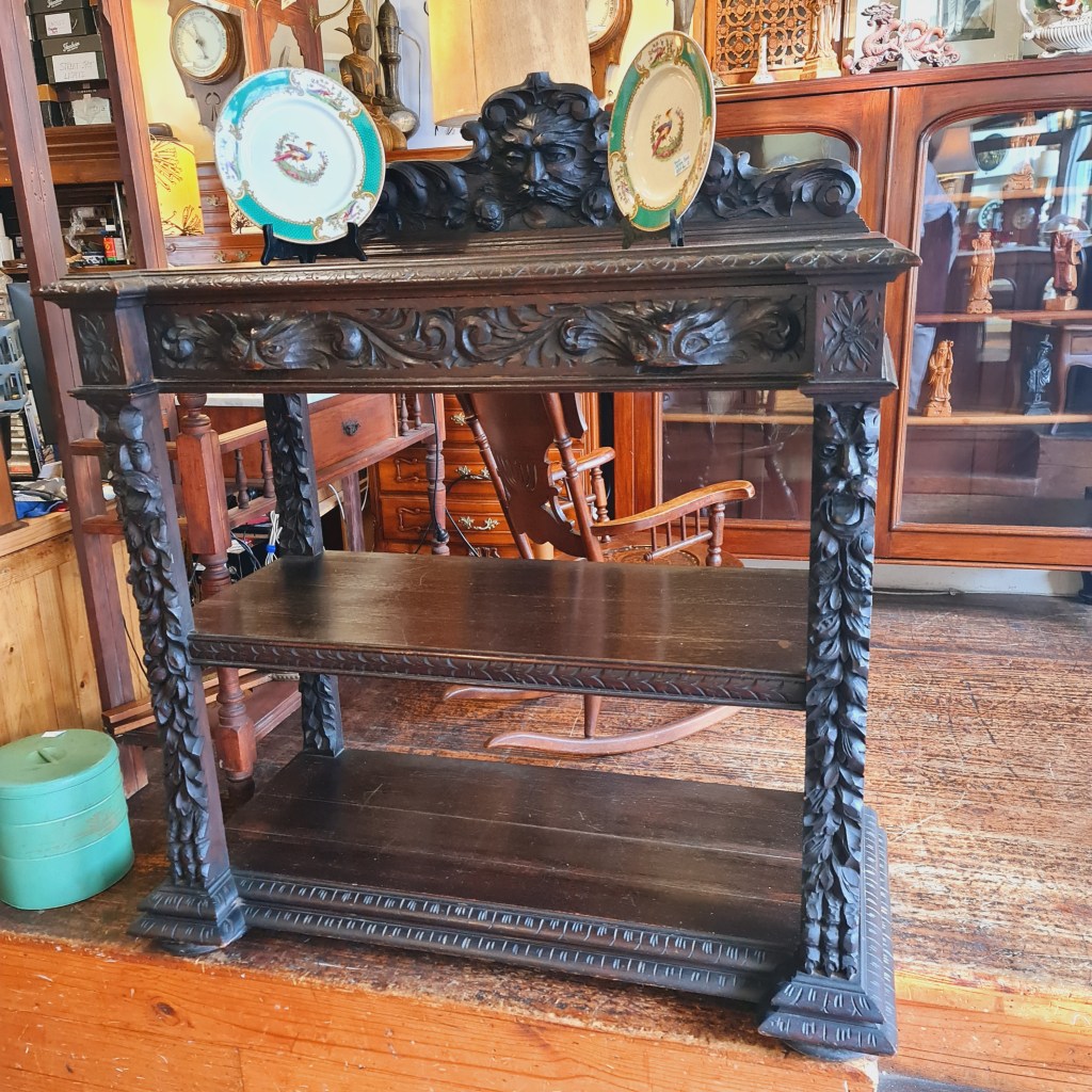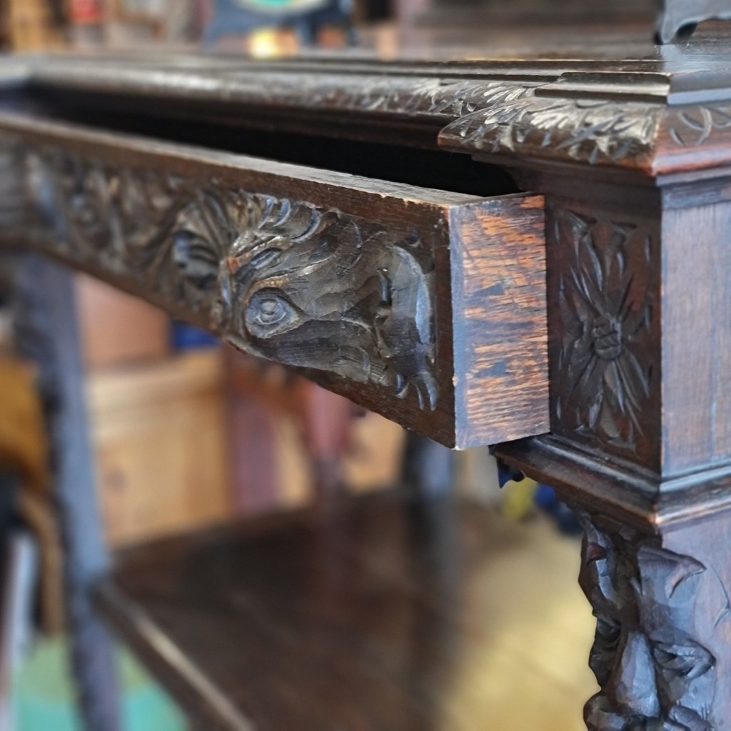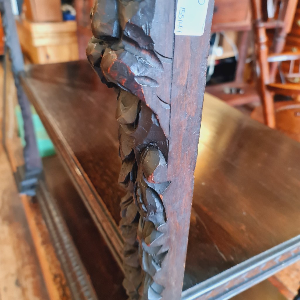 Three tier servery or watnot made from oak and dating back to the late 1800’s. Made in Wales and featuring detailed carving of lions.