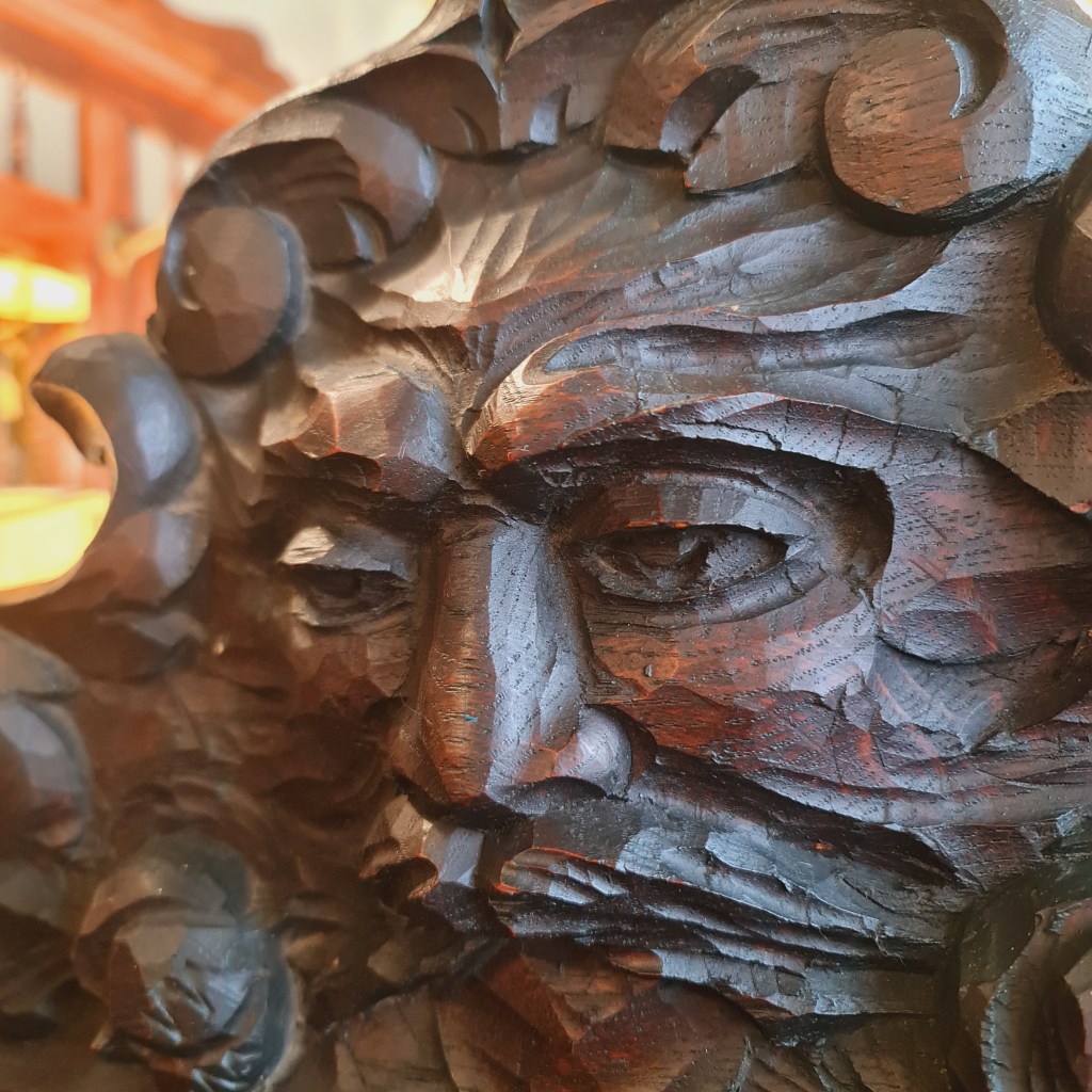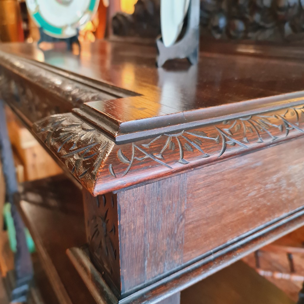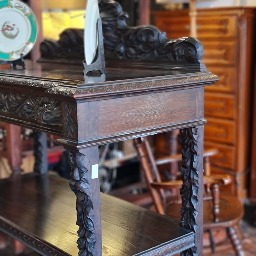 Three tier servery or watnot made from oak and dating back to the late 1800’s. Made in Wales and featuring detailed carving of lions.